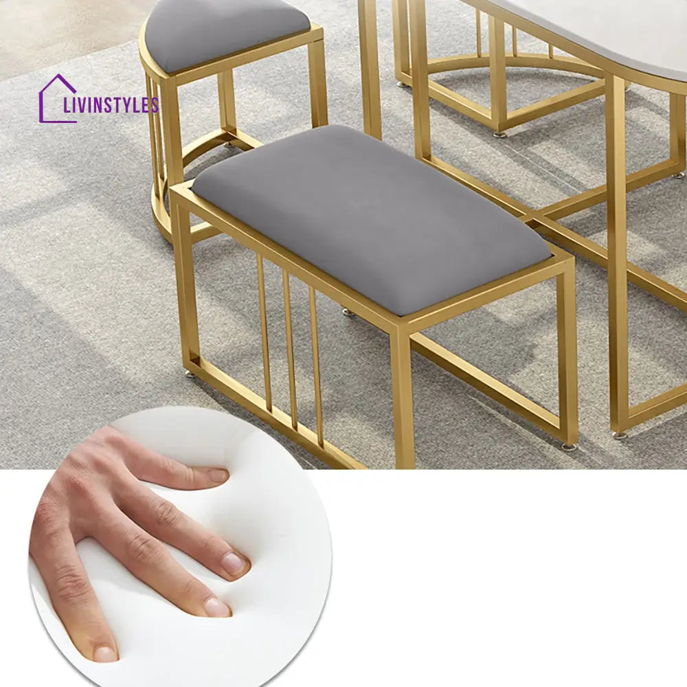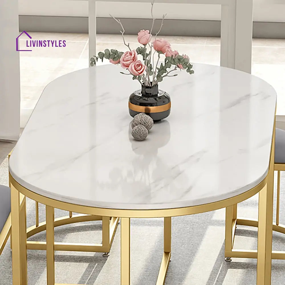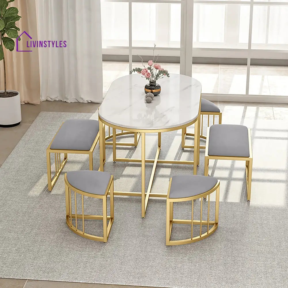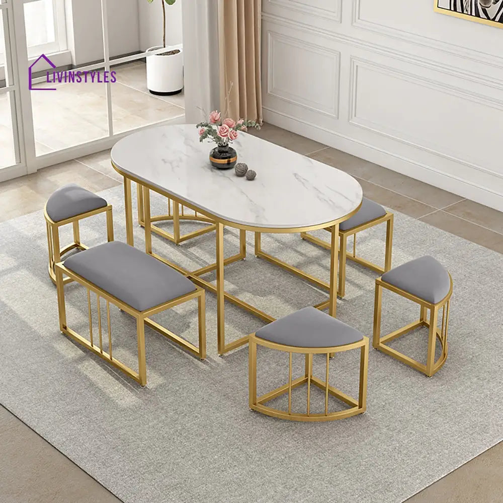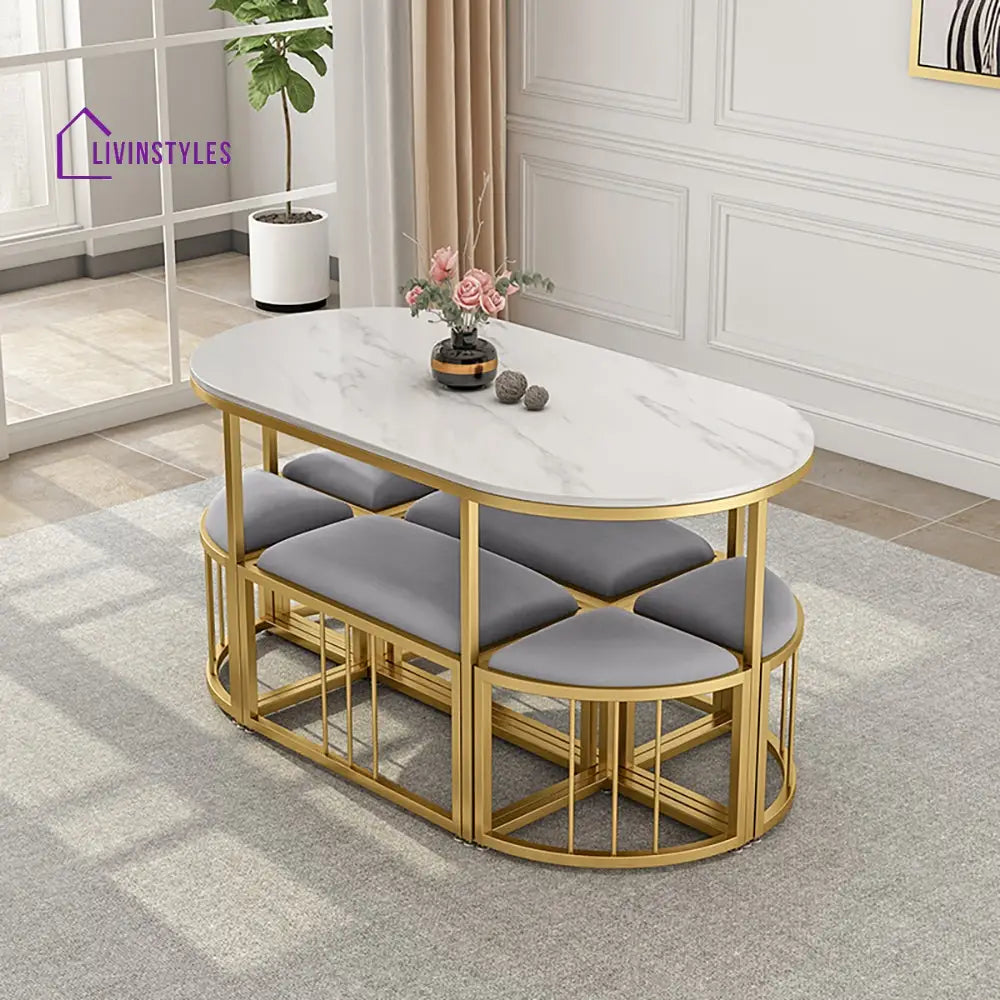 Add a touch of luxury to your dining space with this 6-Seater Dining Table, crafted with a durable stainless steel frame and finished in elegant gold PVD coating. The table features a composite marble top, combining the richness of natural stone aesthetics with long-lasting durability.