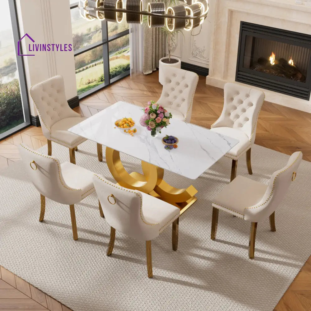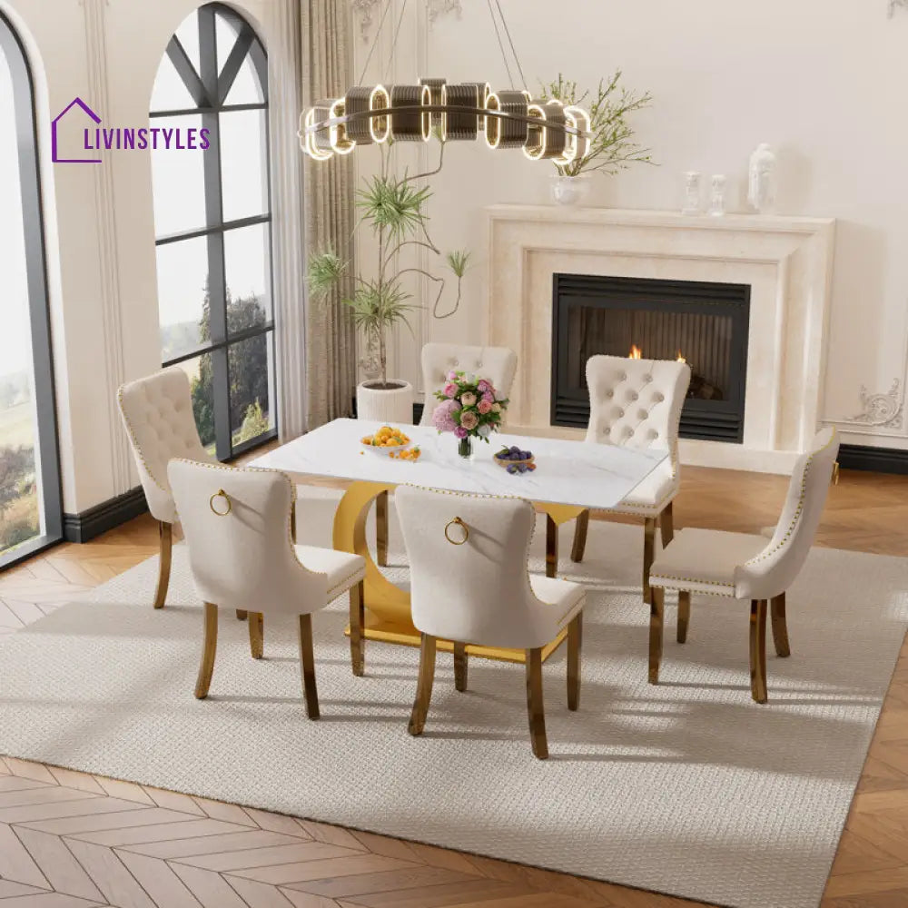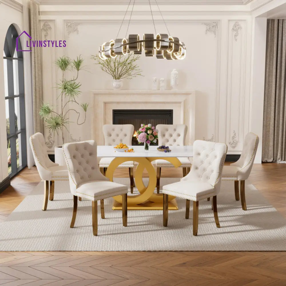 Available in Rose Gold, Black, Gold, and Silver finishes, this set lets you choose the perfect match for your interiors. Offered in 4-seater and 6-seater sizes, it adapts seamlessly to compact dining spaces or larger family settings. Paired with standard design chairs, it ensures comfort and style for everyday meals as well as special occasions.