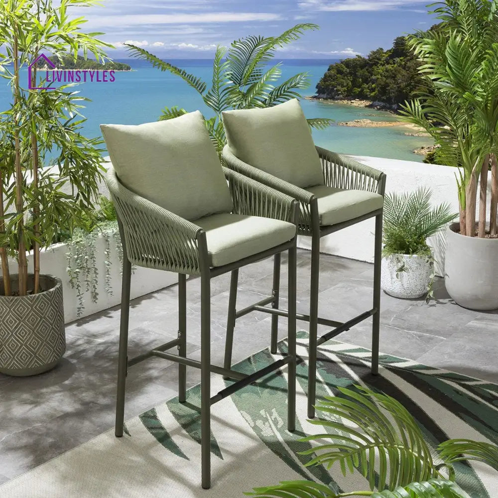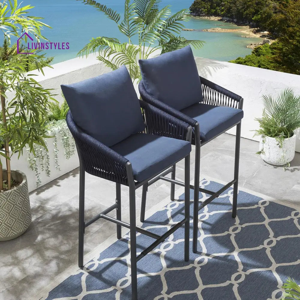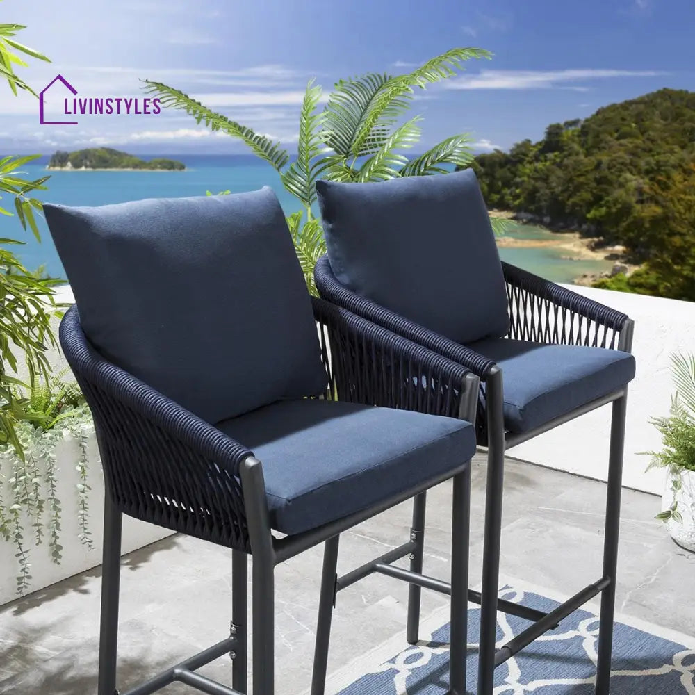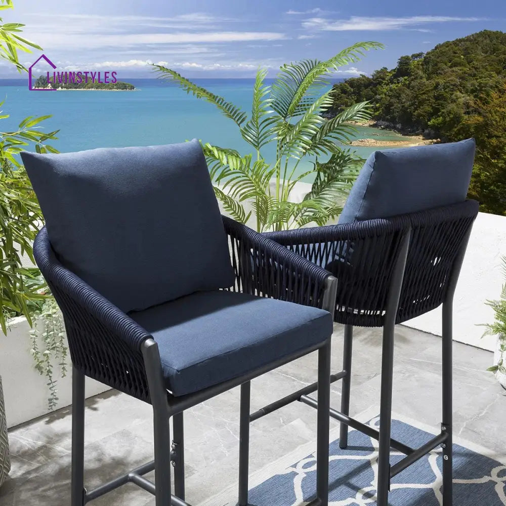 - Patio Bar Chair This includes high-top Bar chairs. The MS frames Powder coated and Handwoven With Braided & Rope seats are weather resistant to guard against inclement weather. The Bar stool is coated to guard against everyday wear and tear. The chairs can be easily stored under the high dining table making this set a perfect space saver for any outdoor area.