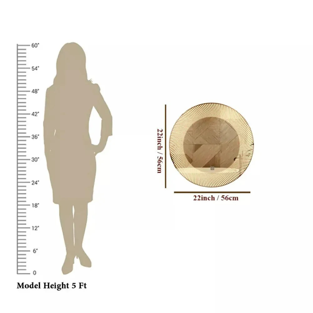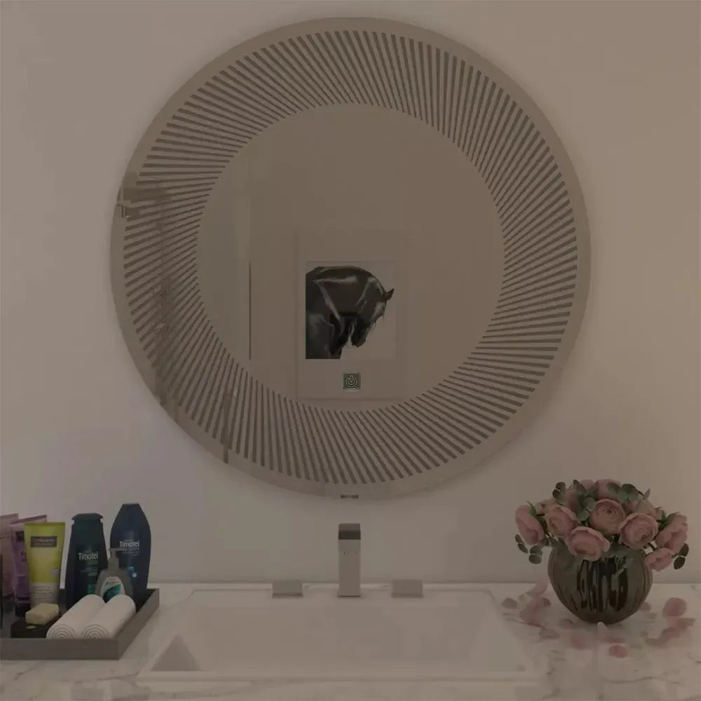 This is a stylish and contemporary circular bathroom mirror featuring integrated LED lighting arranged in a radial striped pattern. The LED light provides a warm glow, perfect for creating an inviting and functional space in your bathroom. The mirror is 22 inches (56 cm) in diameter, making it an ideal size for most bathroom vanities. It includes a touch-sensitive power button on the mirror surface for easy on/off control of the LED light. This mirror not only enhances visibility but also adds a decorative and modern element to your bathroom decor.