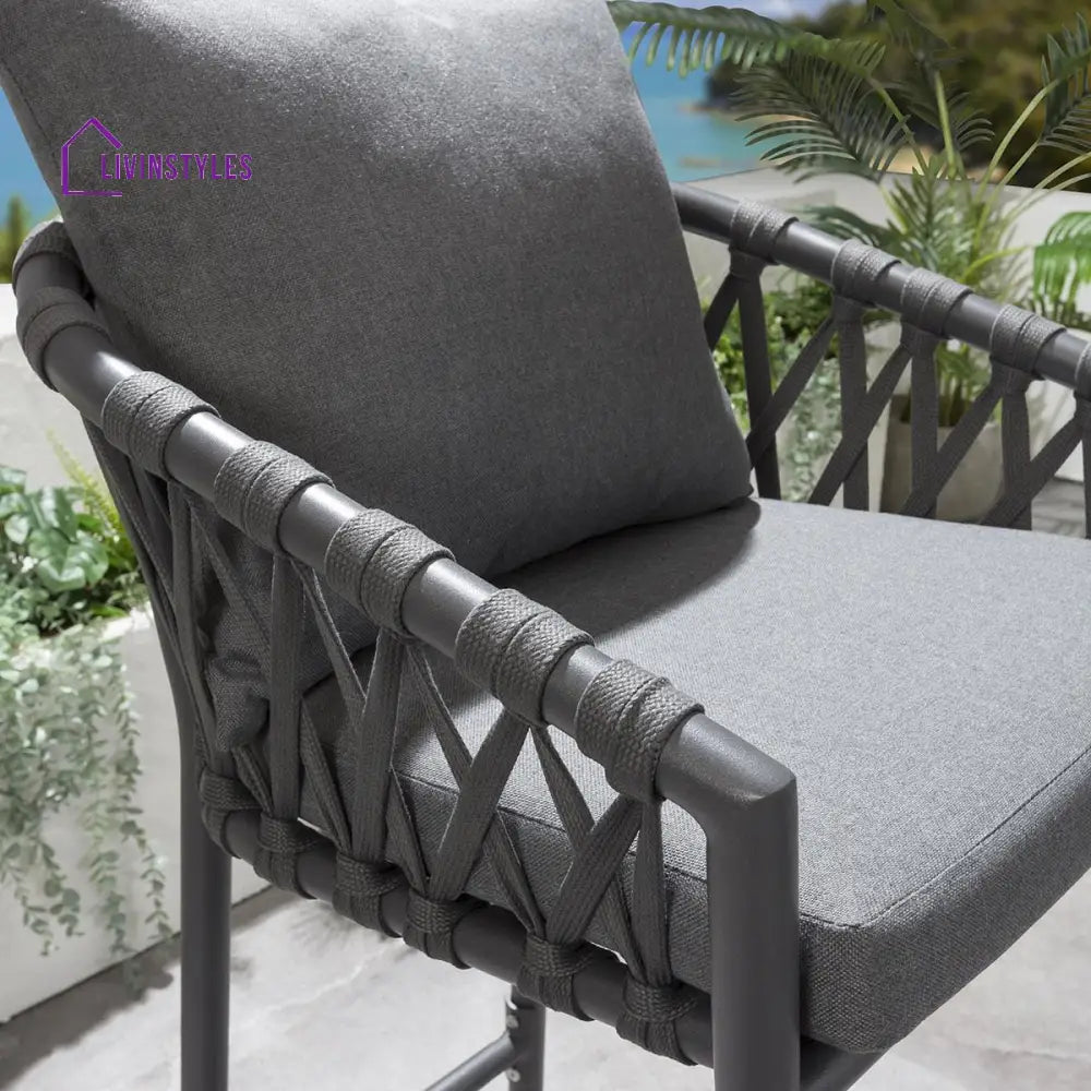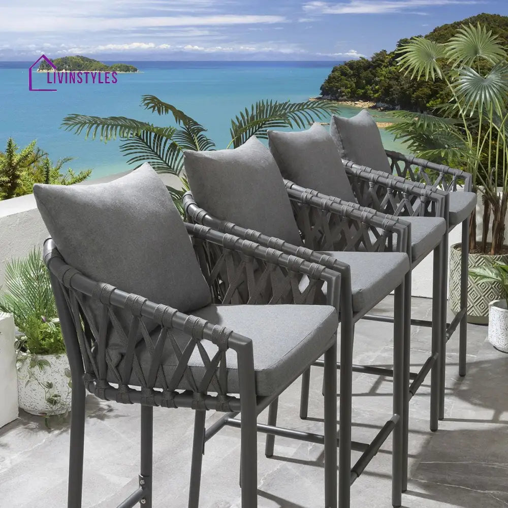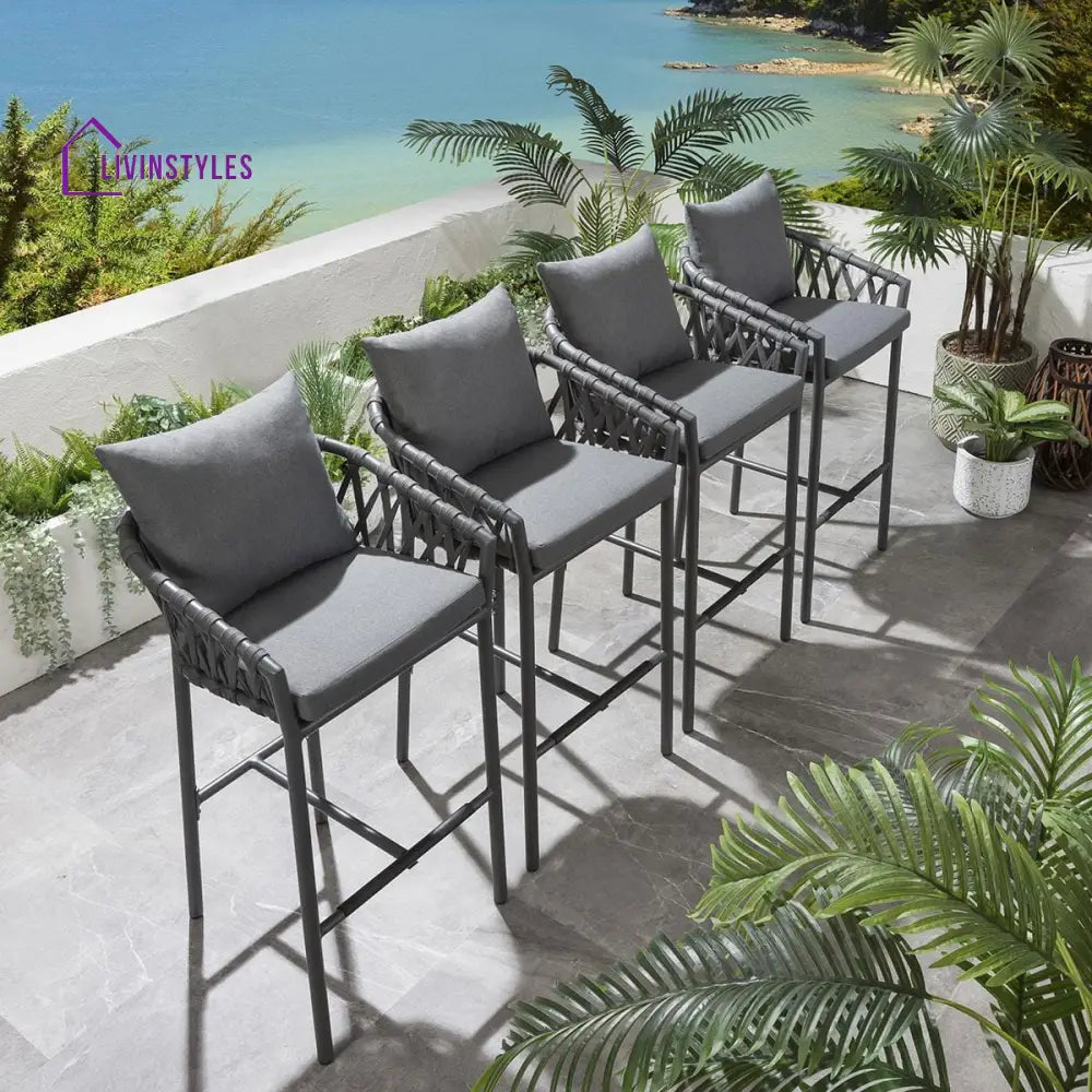 - Patio Bar Chair This includes high-top Bar chairs. The MS frames Powder coated and Handwoven With Braided & Rope seats are weather resistant to guard against inclement weather. The Bar stool is coated to guard against everyday wear and tear. The chairs can be easily stored under the high dining table making this set a perfect space saver for any outdoor area.