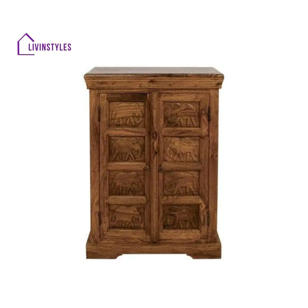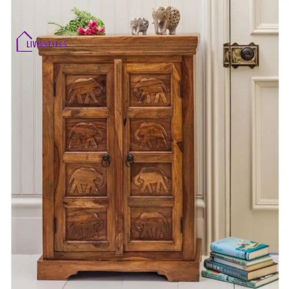 A1: This storage cabinet is crafted from Solid Sheesham Wood, known for its strength, beautiful grain, and natural durability.