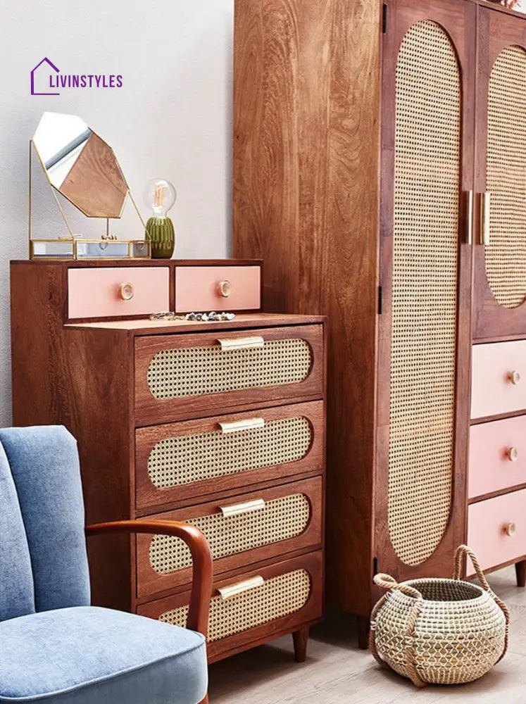 Our Rattan collection pairs darkly-stained Sheesham wood with pops of color and hand-woven cane sheeting, for subtly colorful, contemporary pieces that will provide stylish storage space in your home. In an eclectic style that takes inspiration from mid-century furniture pieces, this chest of drawers combines softly curved cut-outs in its large bottom four drawers with hand-woven cane sheeting. It also has two smaller drawers at the top, painted delicate pastel pink. The final touch? Its door handles and drawer pulls are made from gold metal, or ceramic with a crackle glaze.