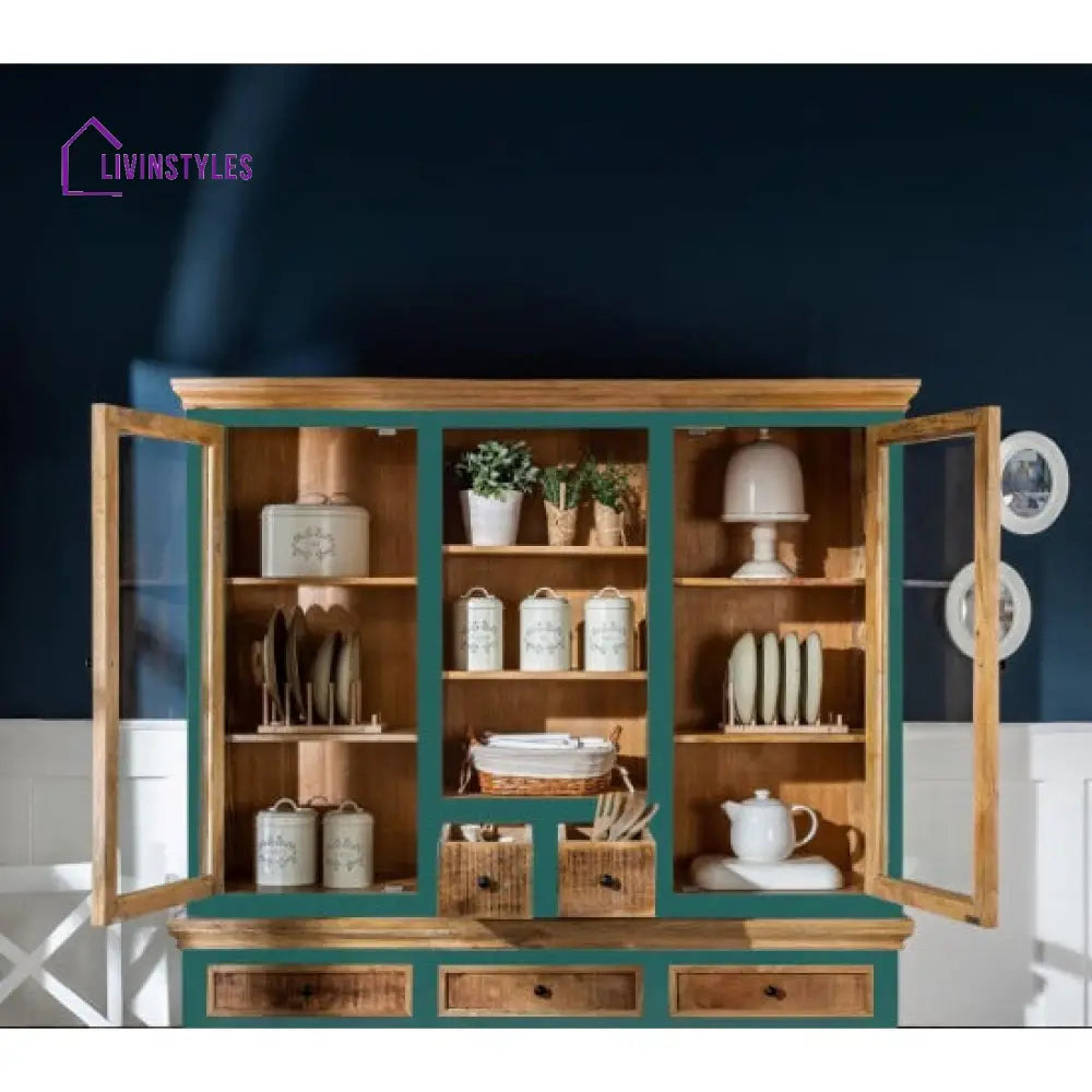 Introducing the magnificent large-sized crockery cabinet, expertly crafted from exquisite mango wood, boasting a captivating combination of a pristine green exterior and a warm, natural interior. This remarkable cabinet is designed to enhance your kitchen or dining area with its elegant and functional features.
