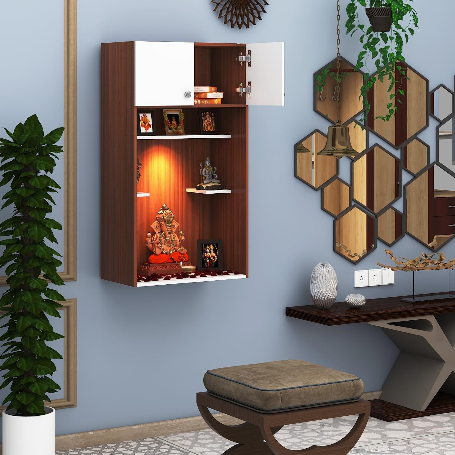 It offers ample space for idols and decorative puja essentials. The dual-door storage cabinet allows you to neatly organize incense sticks, diyas, holy books, and other accessories. Its smooth white matte finish with golden knobs makes it a stylish yet traditional choice for your sacred space.