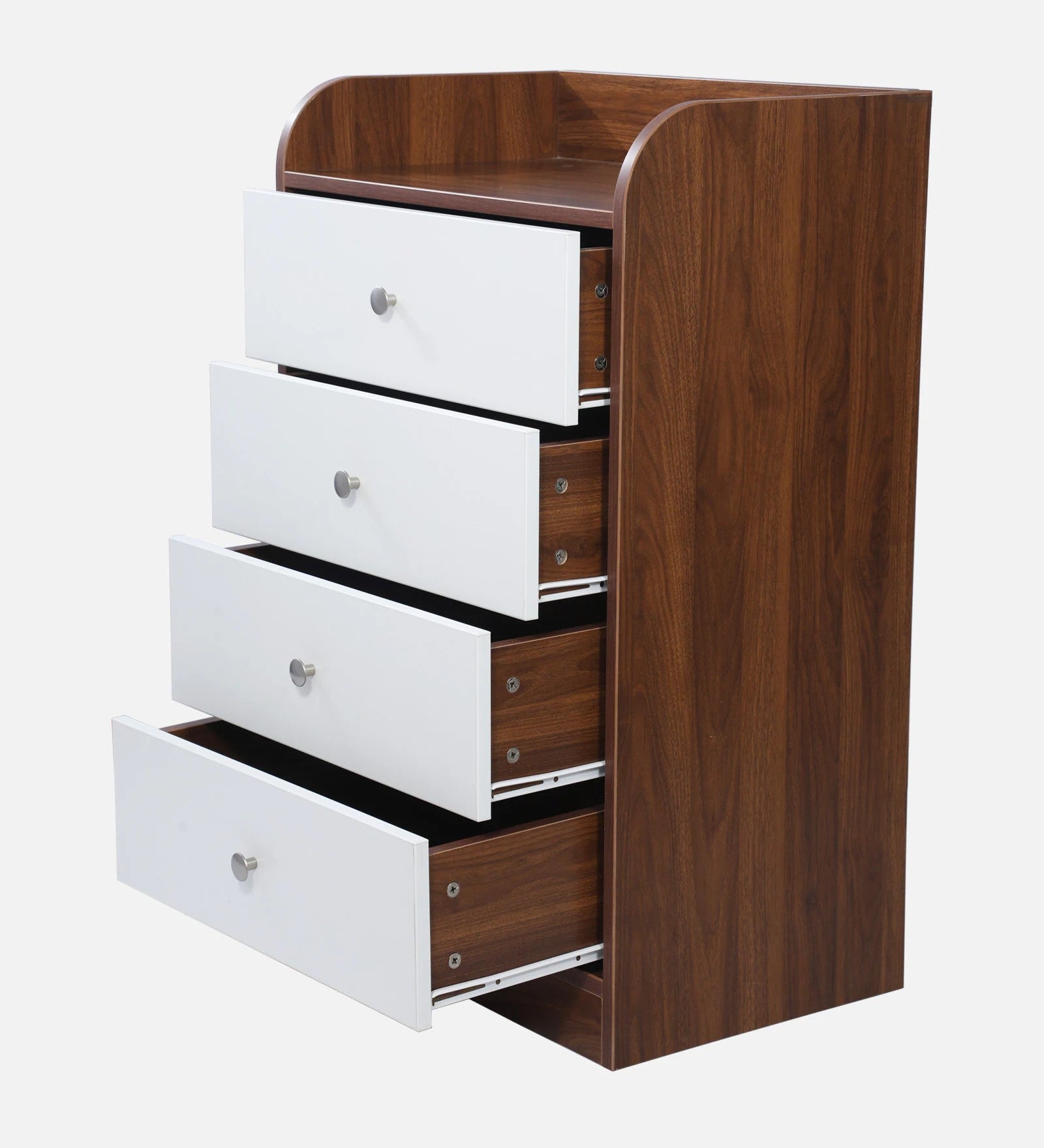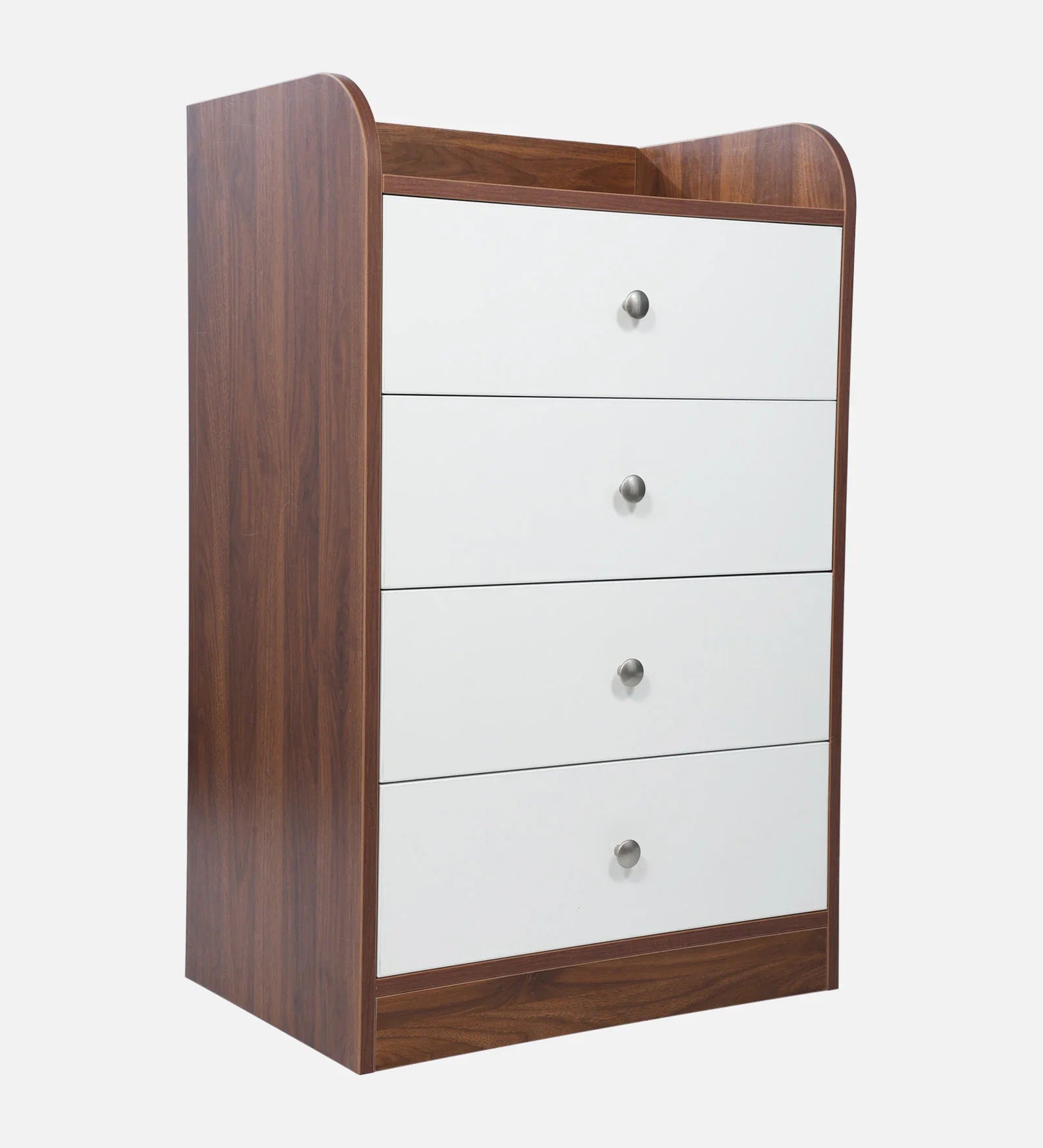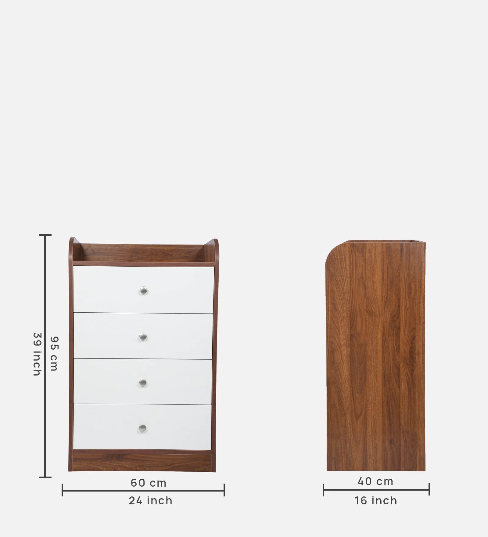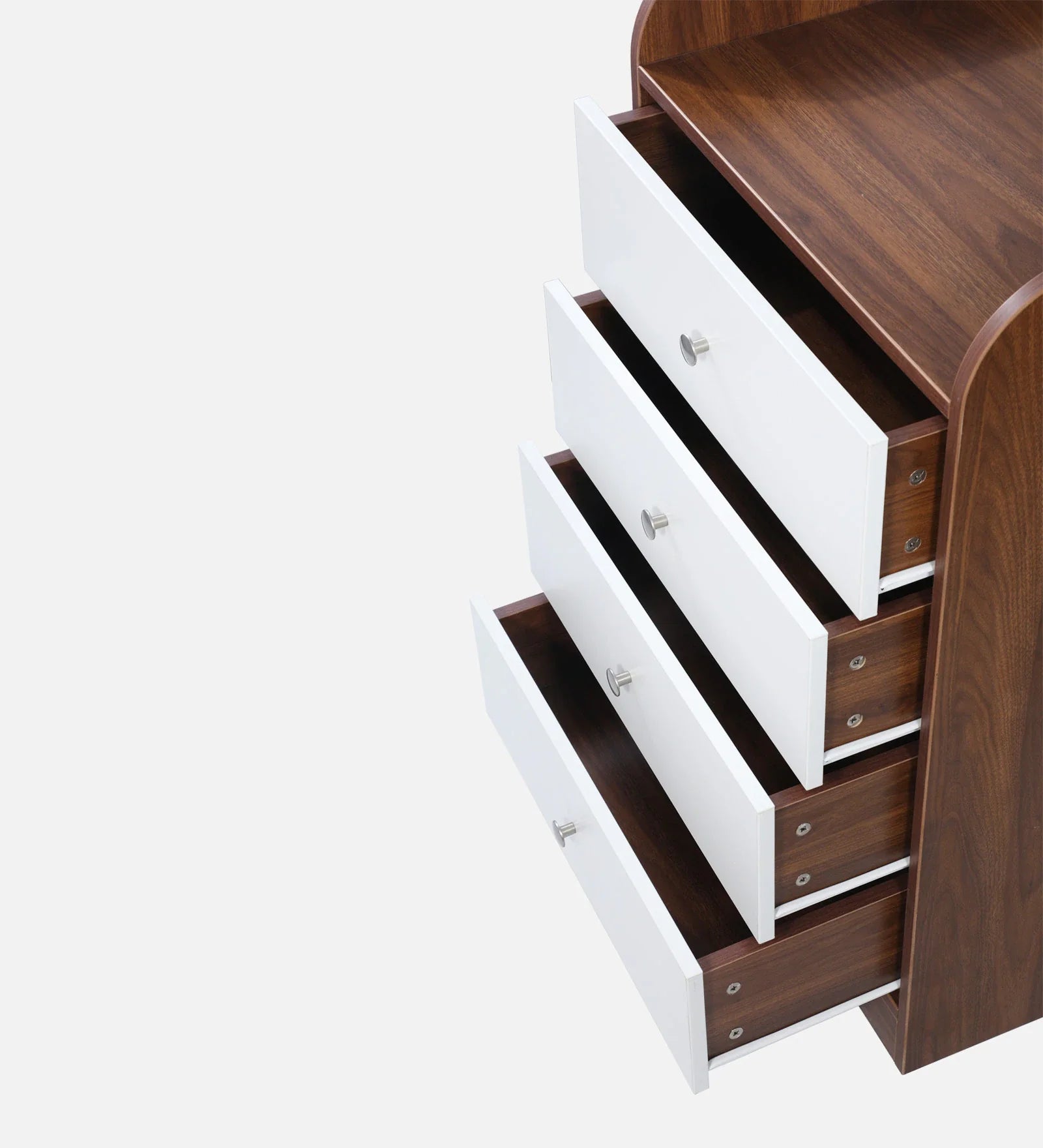 Crafted with precision and elegance, the OmkarWood Aranya Chest of Drawers brings natural warmth and modern simplicity into any living space. Featuring a rich walnut-finish frame paired with sleek matte-white drawer fronts, this 4-drawer unit offers both style and function. The curved top edges and minimalistic metal knobs provide a refined touch, making it suitable for bedrooms, living rooms, or entryways.