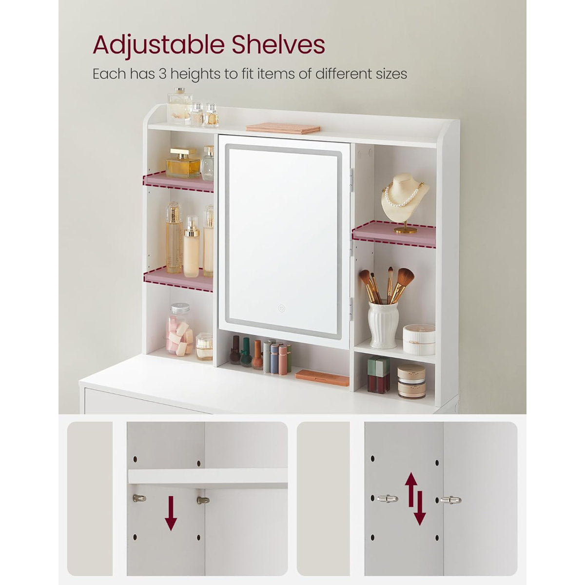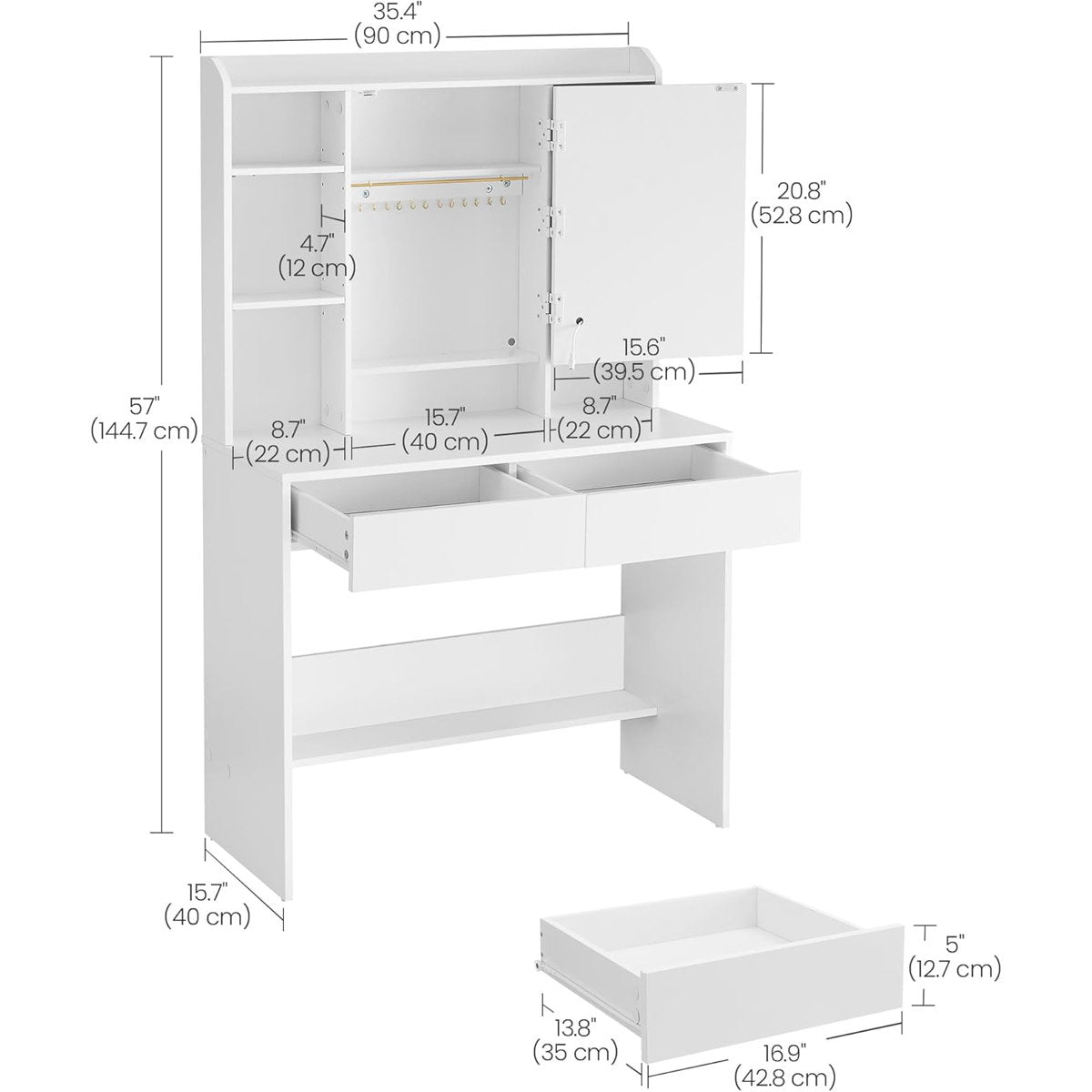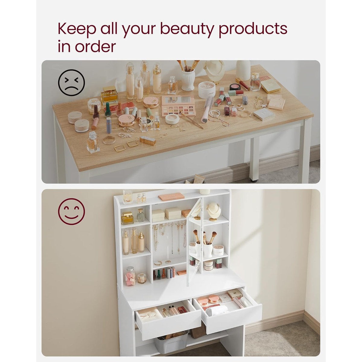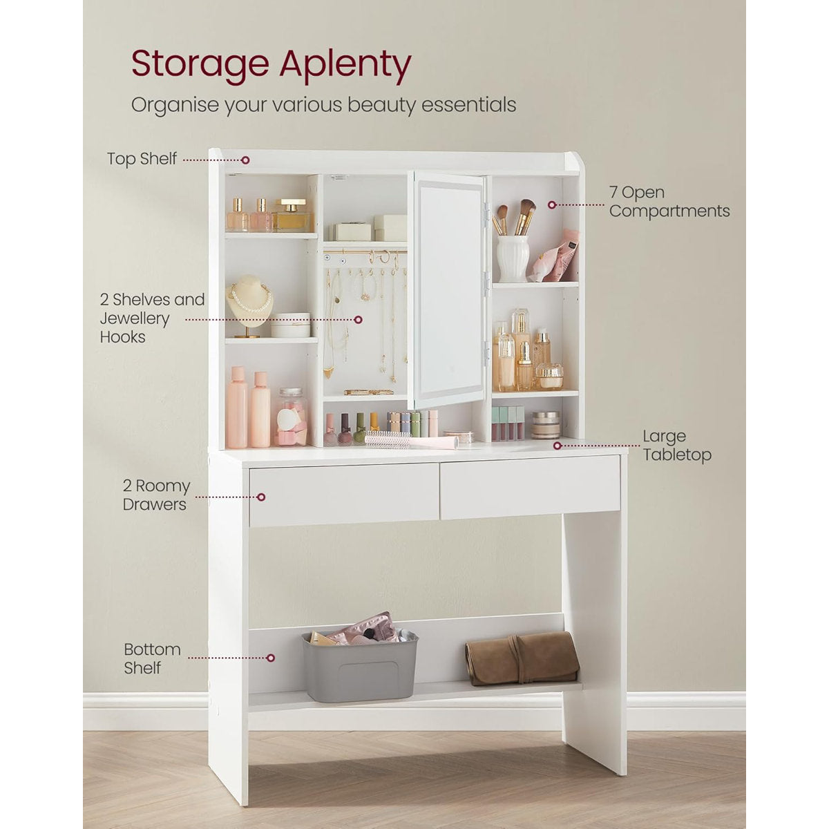 With side shelving units, 2 spacious drawers, and a wide tabletop, you’ll have ample storage for cosmetics, skincare, and accessories. Equipped with metal drawer runners, anti-tilt safety hardware, and a 75 kg weight capacity, it's built to last and easy to maintain.