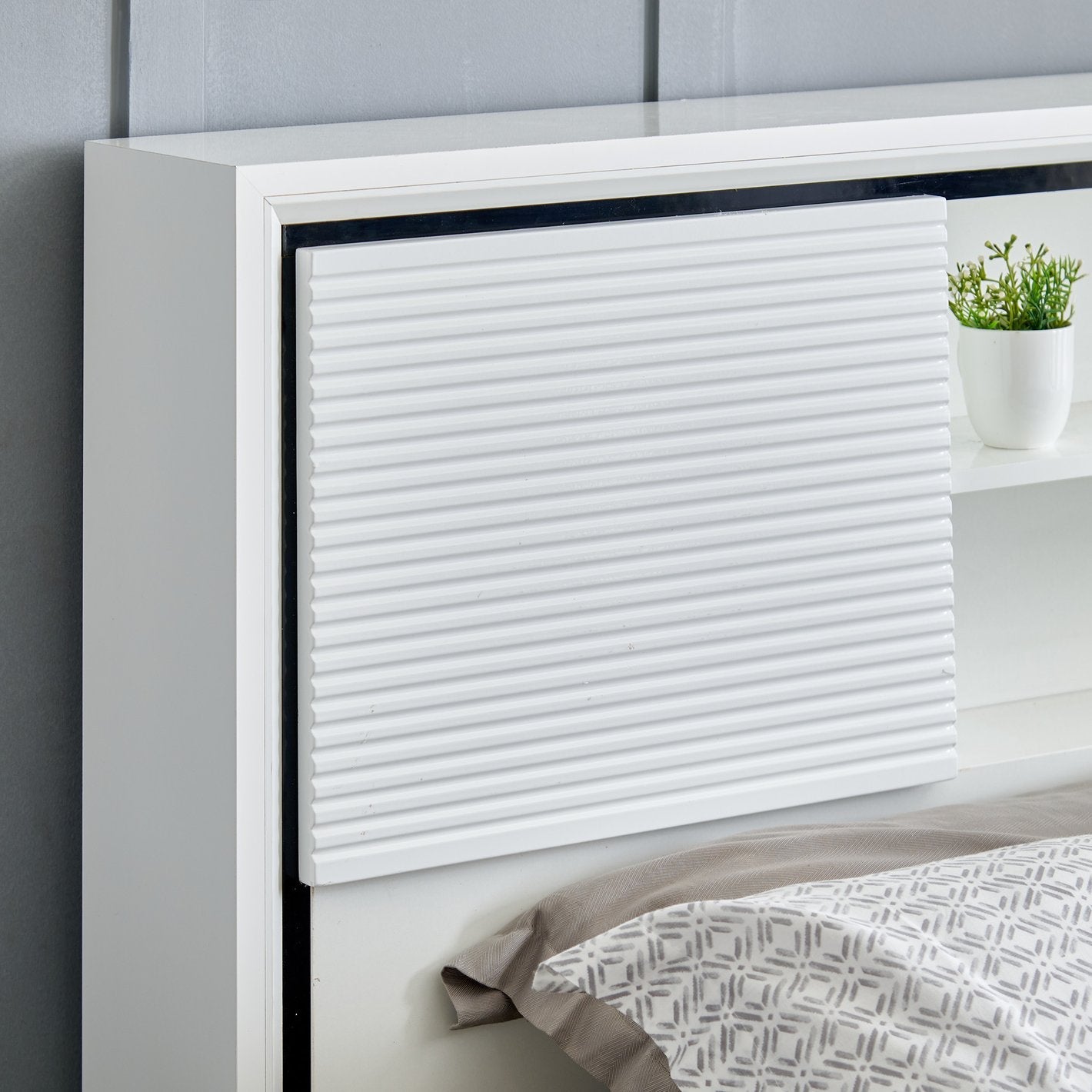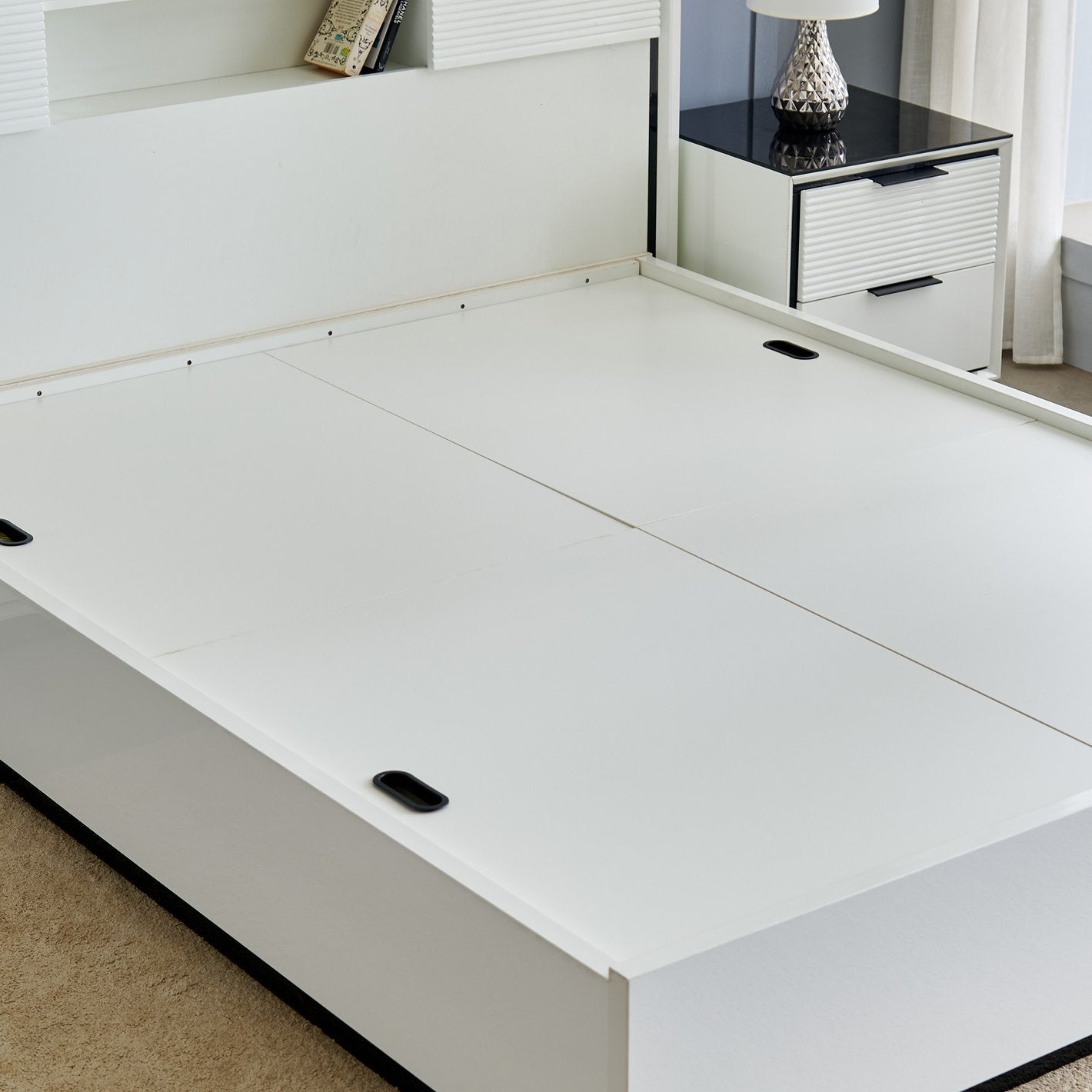 Upgrade your bedroom with the Omkarwood "LuxeNest" Premium Engineered Wood King Size Bed, a perfect blend of style, storage, and comfort. Expertly crafted from high-quality engineered wood, this modern bed showcases a sleek high-gloss white finish complemented by elegant grooved panel detailing on the headboard and side tables.