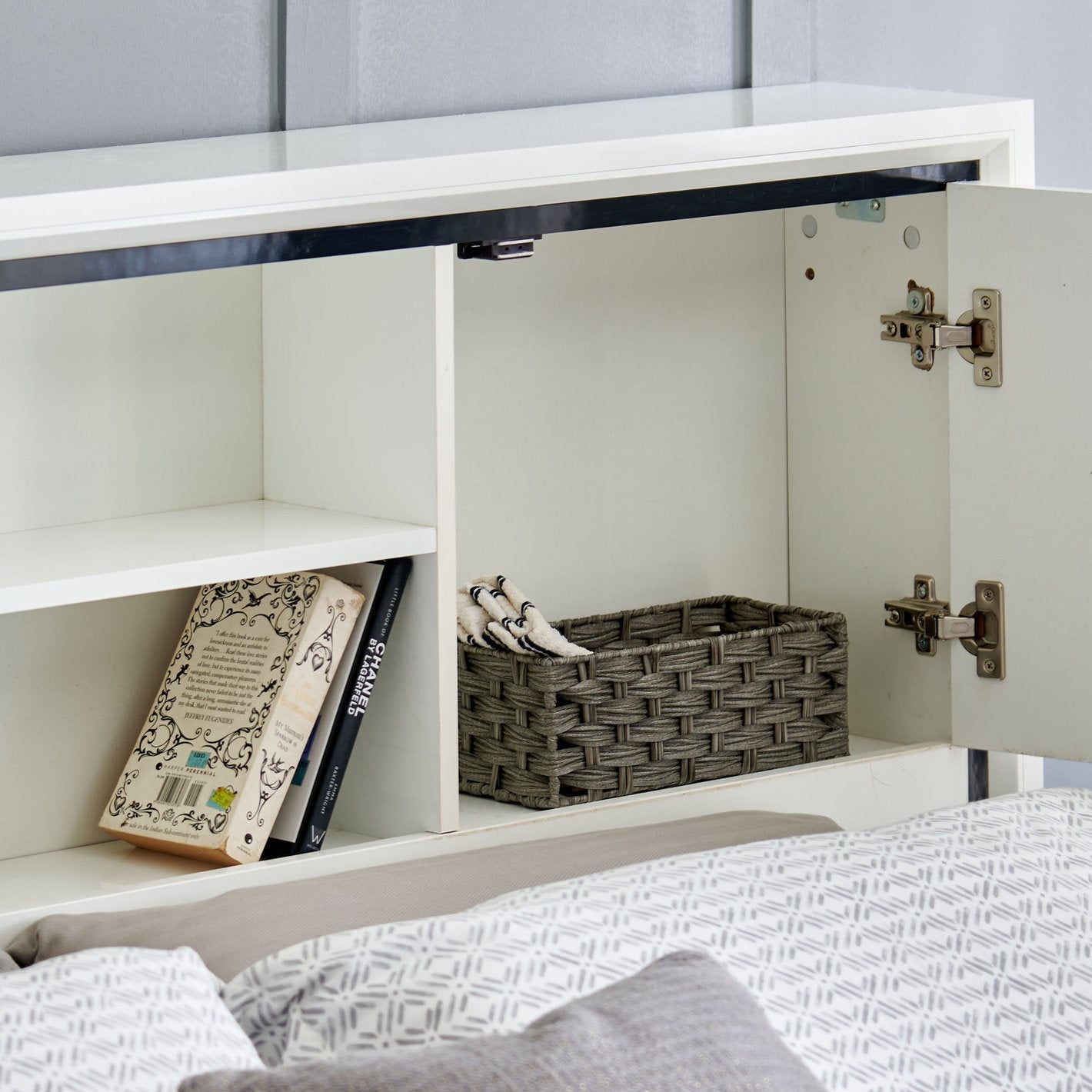 Integrated Headboard Shelving with dual sliding shutters for accessible storage of books, accessories, and décor.