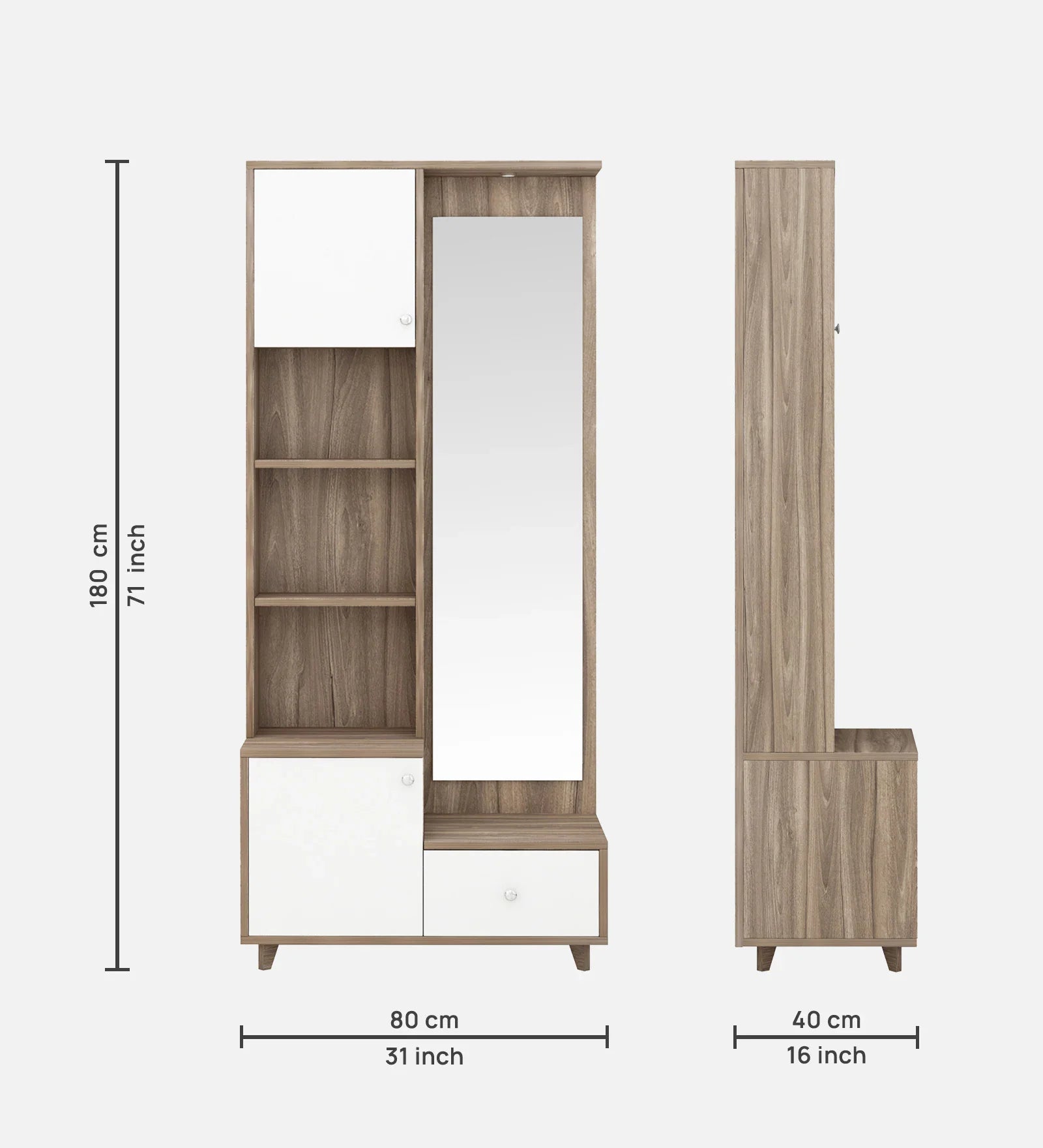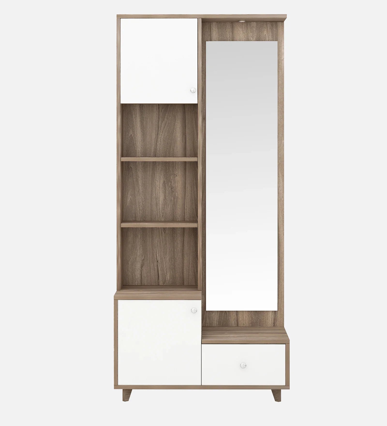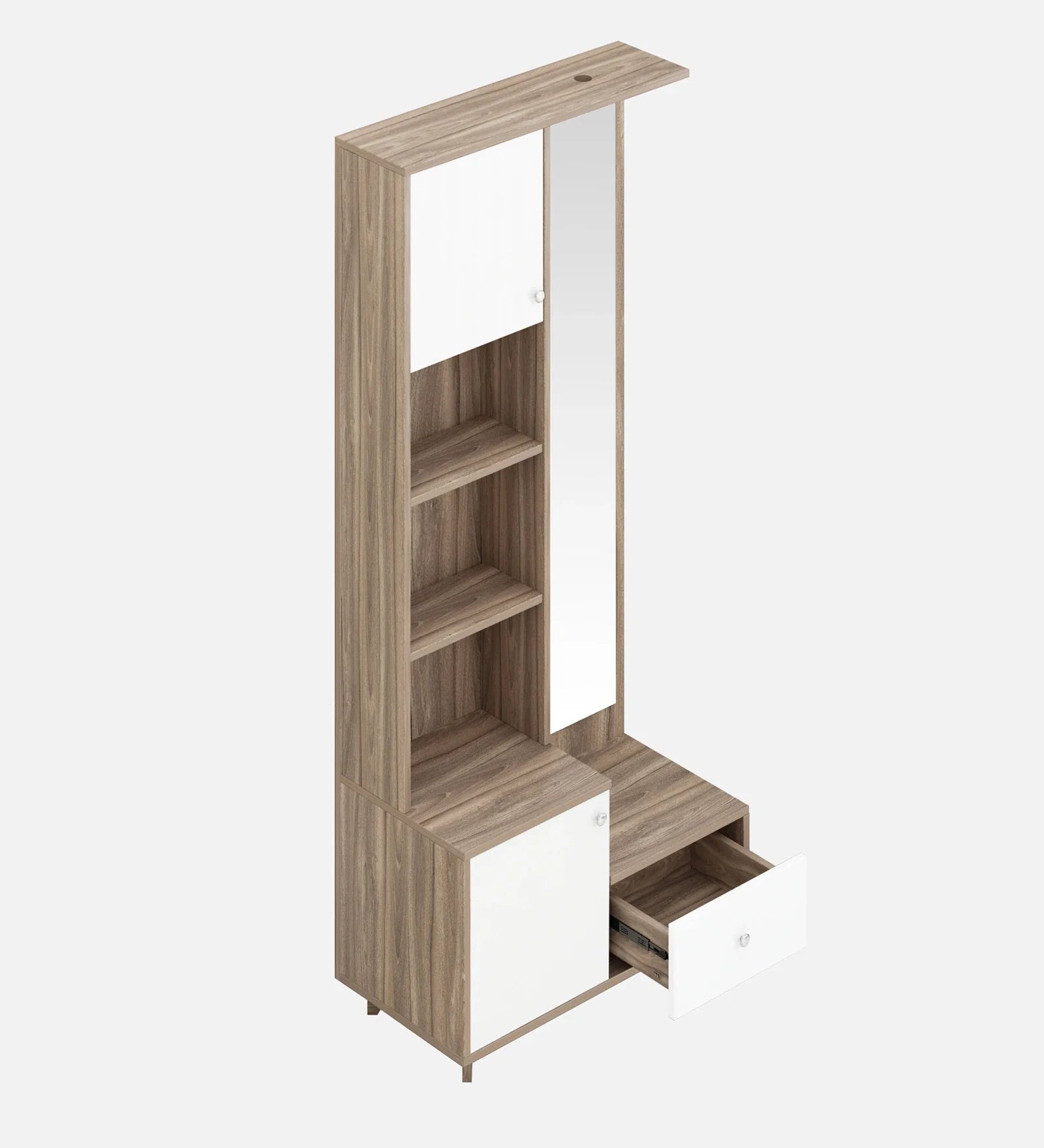 The Omkar Novelle Dressing Console redefines elegance with its minimalist silhouette and functional storage. Made from superior quality engineered wood, it combines open shelves for display and concealed cabinets for privacy. The tall mirror and balanced design create an inviting focal point for bedrooms or dressing areas. Perfect for those who appreciate modern design and superior craftsmanship.