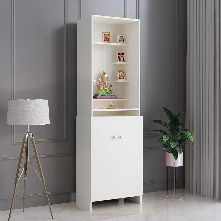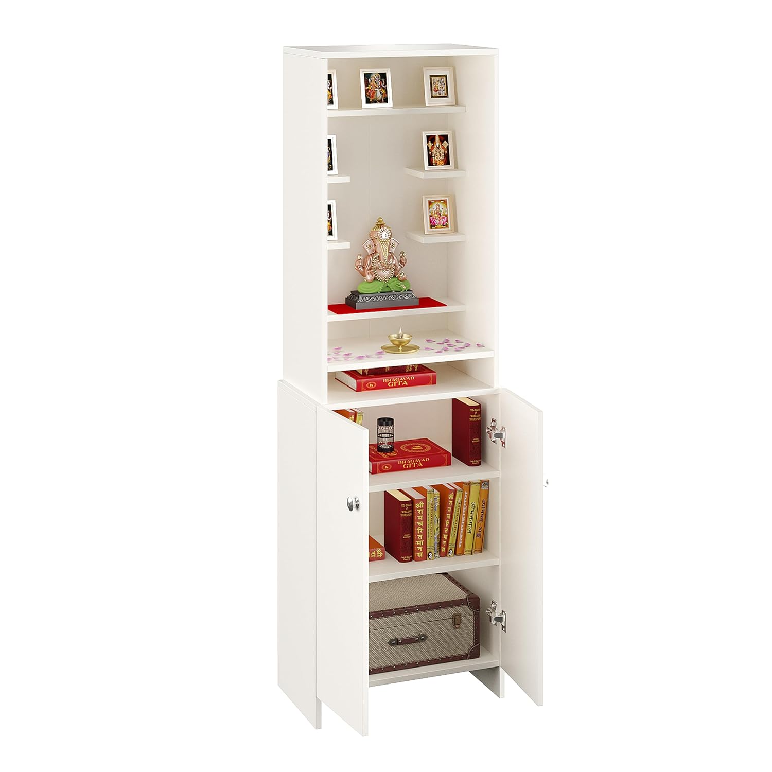 Dedicated Storage: Lower cabinet with dual doors provides ample space to keep incense, diya, and holy books organized.