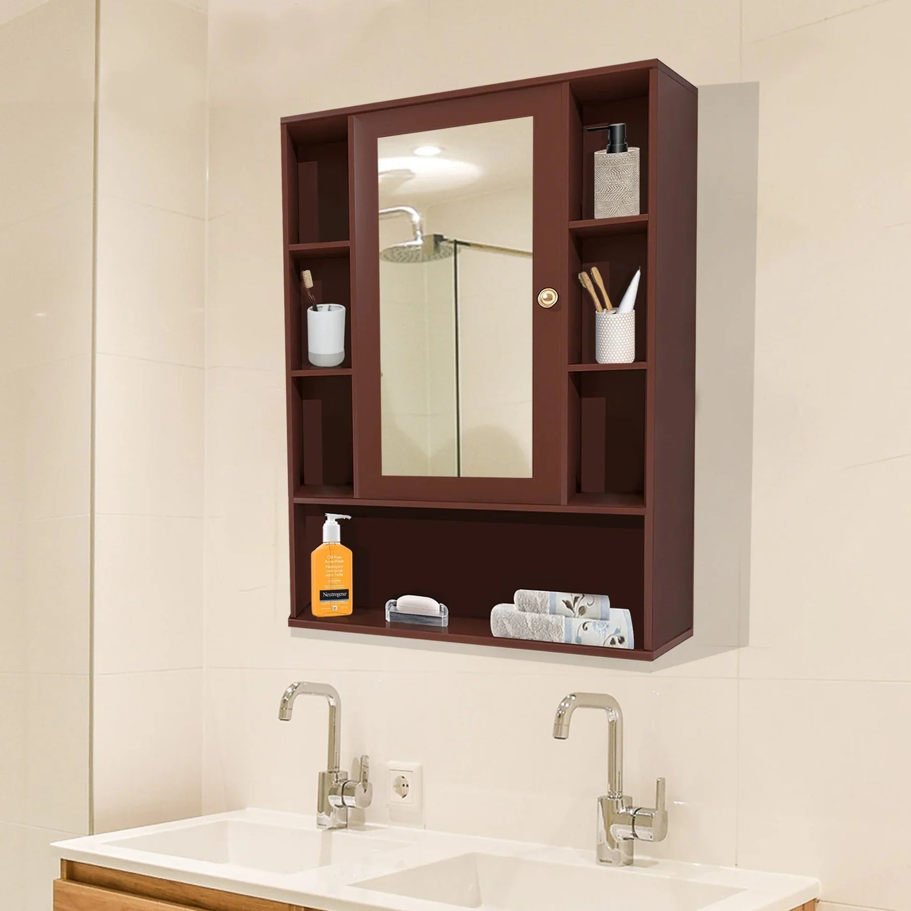 Flanked by 9 open storage shelves, it offers ample space to neatly organize toiletries, cosmetics, grooming essentials, and decorative items. The rich brown finish adds warmth and elegance to any bathroom décor, while the space-saving wall-mounted design keeps countertops clutter-free.