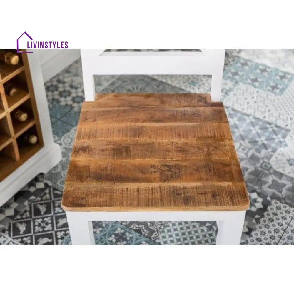 A: The chairs feature a natural finish on the top and a combination of white and natural finishes at the bottom, with a rough mango finish adding rustic charm.