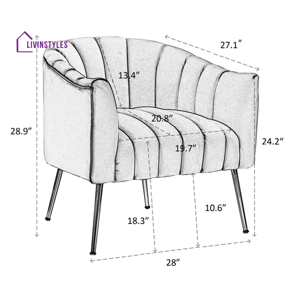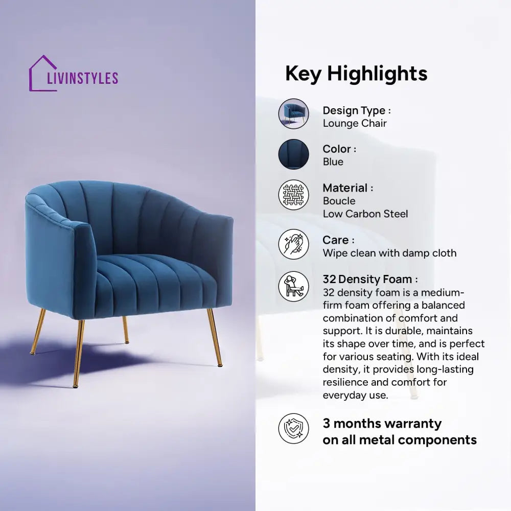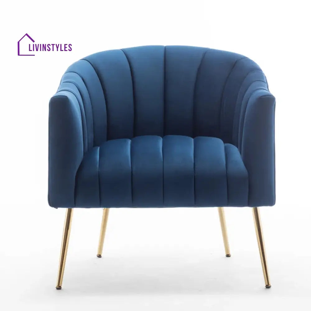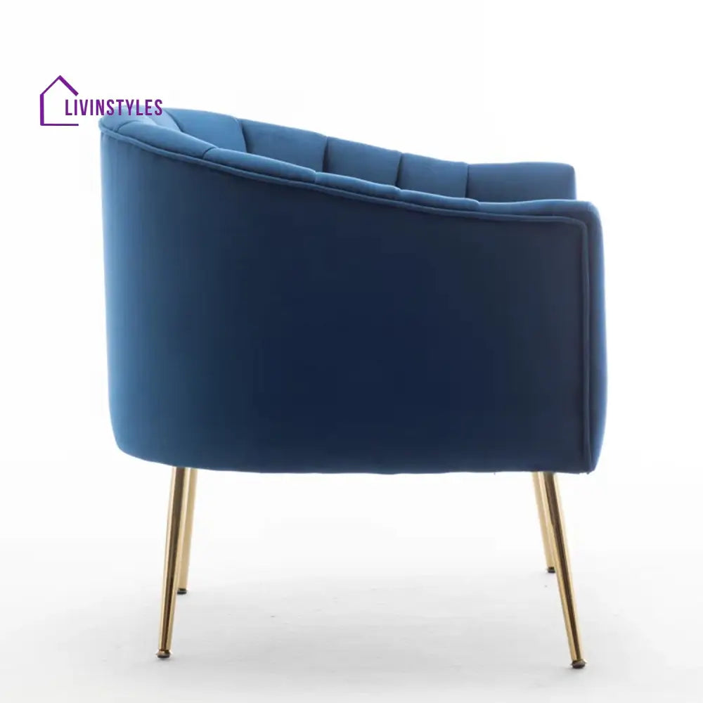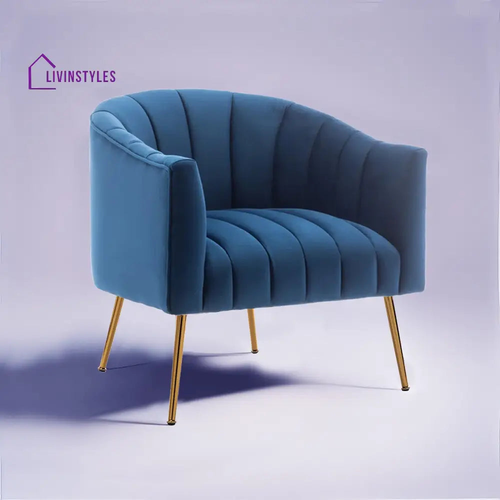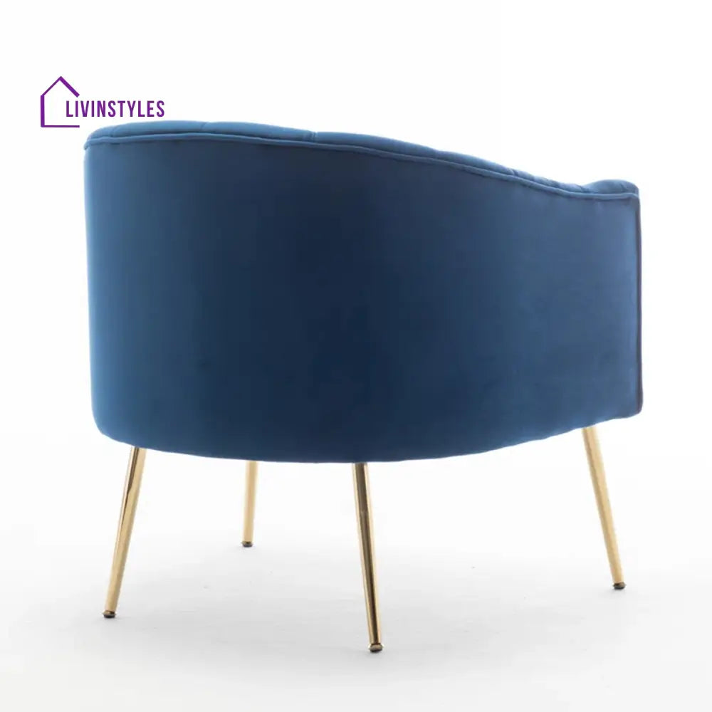 The Gilded Lounge Armchair Elegance Velvet Blue features a curved, channel-tufted backrest upholstered in luxurious velvet, offering both style and comfort. Complemented by sleek, golden legs, this armchair adds a touch of sophistication and modern charm to any living space or lounge area.