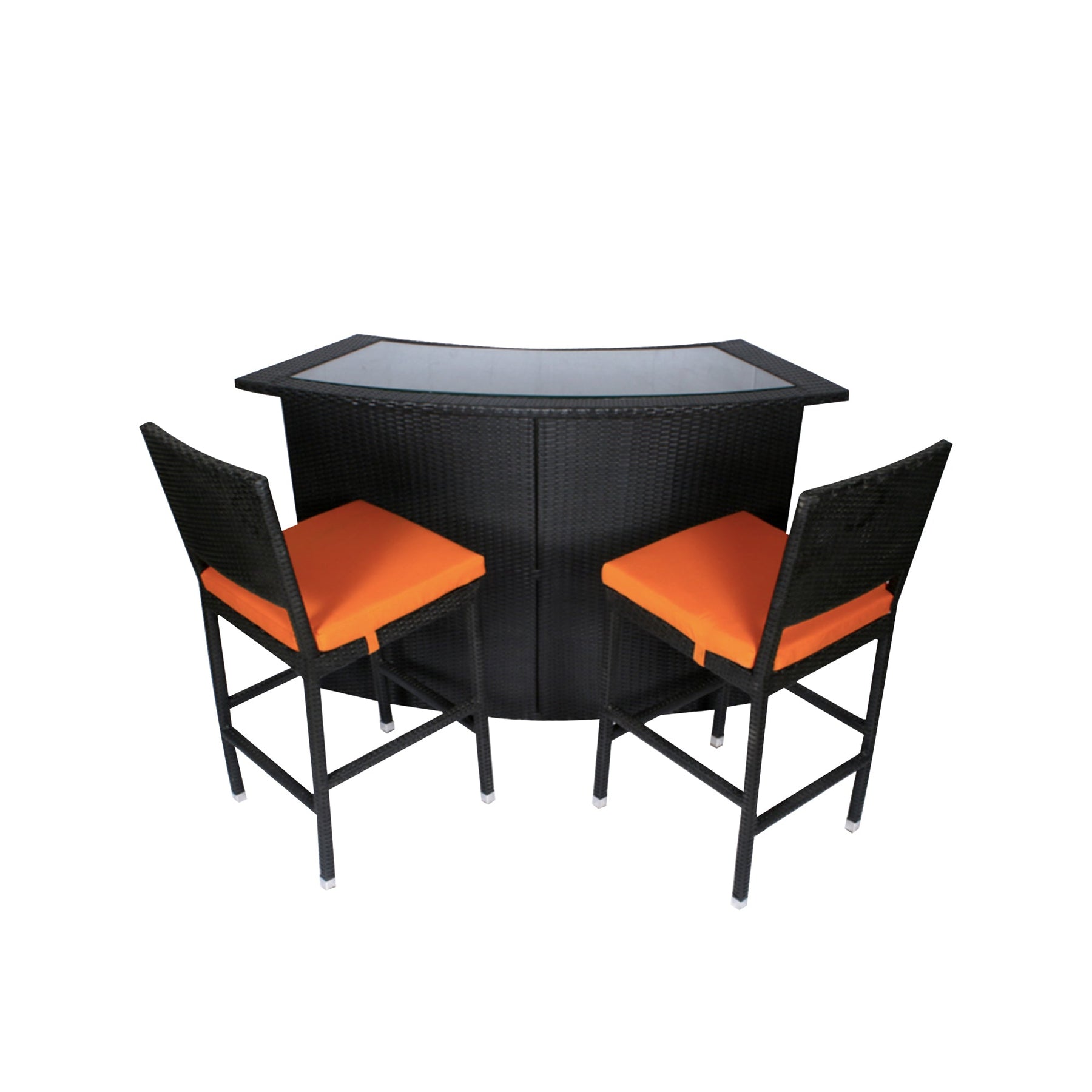 - Patio Bar Sets This 3 Piece Bar Set includes two high-top Bar chairs and one Bar table. The e-coated steel frames and hand-woven wicker seats are weather resistant to guard against inclement weather. The Bar set is coated to guard against everyday wear and tear. The two chairs can be easily stored under the high dining table making this set a perfect space saver for any outdoor area.