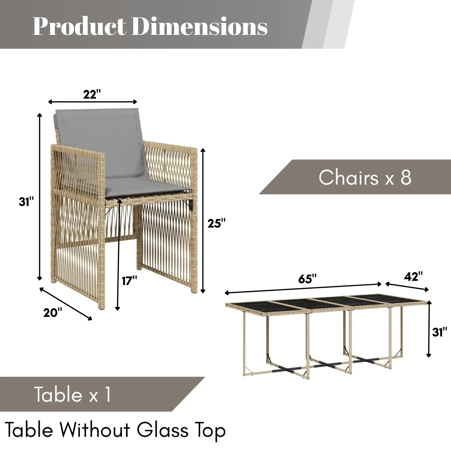 • 8 Chair Dimension: 22″Lx20″Wx31″H