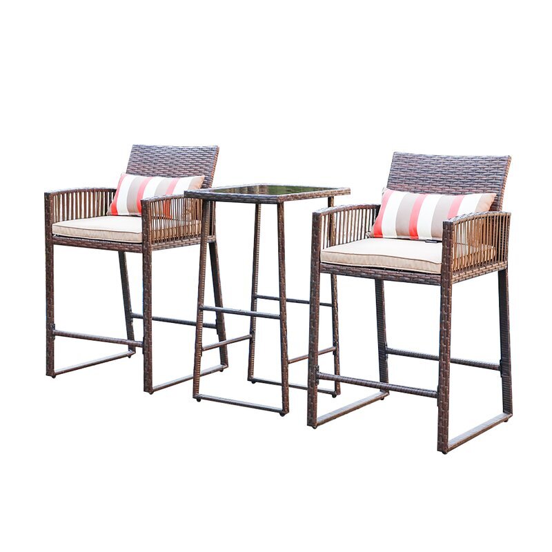 - Patio Bar Sets This 3 Piece Bar Set includes two high-top Bar chairs and one Bar table. The e-coated steel frames and hand-woven wicker seats are weather resistant to guard against inclement weather. The Bar set is coated to guard against everyday wear and tear. The two chairs can be easily stored under the high dining table making this set a perfect space saver for any outdoor area.