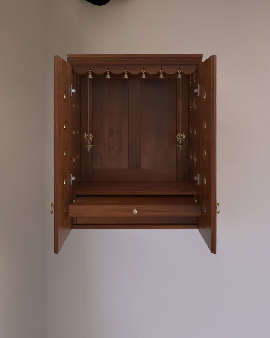 Elena - Traditional Pooja Mandir for Home with Doors, Brass Bells & Lamps | Handcrafted Wooden Home Temple