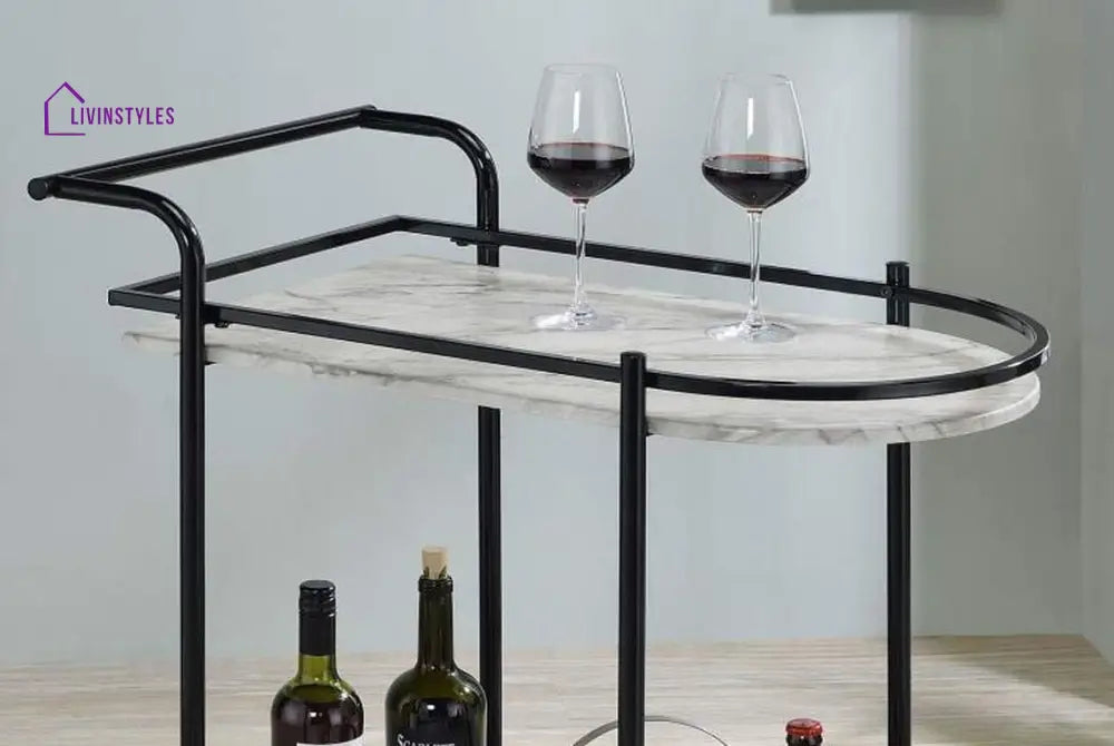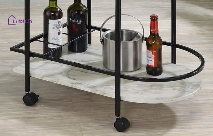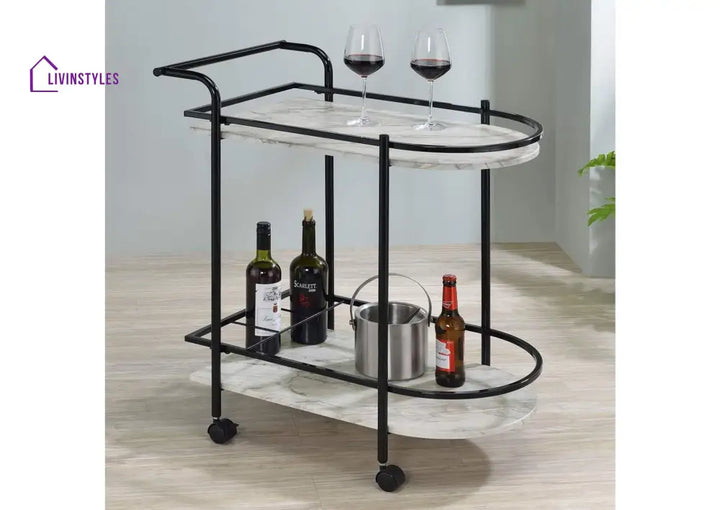 Upgrade your home decor with this sophisticated 2 tier oval trolley. Crafted from high-quality iron with luxurious marble shelves, this modern trolley offers ample space for serving or display. With smooth rolling wheels and a sleek handle, it adds both style and functionality to any space. No assembly required. Available in black.