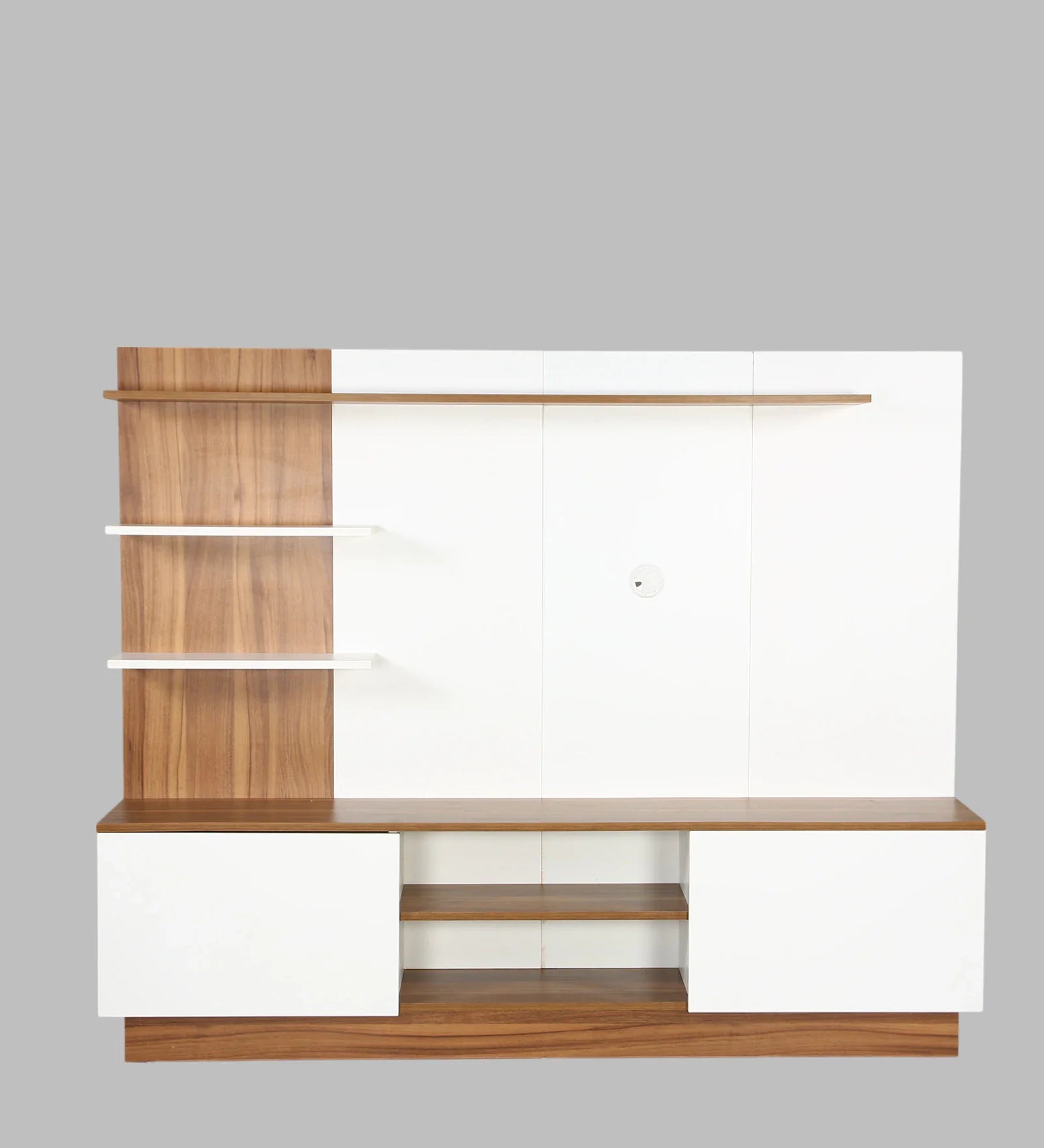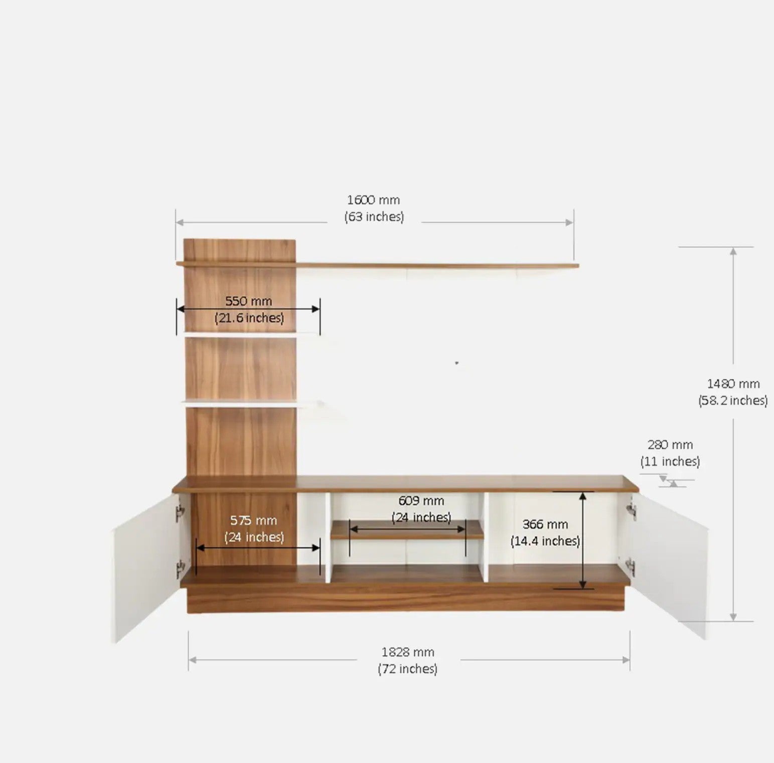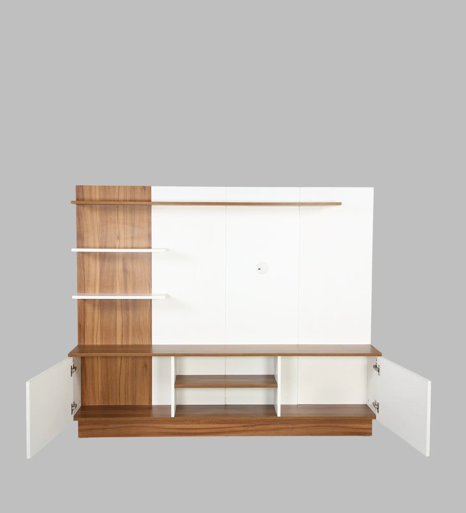 Elevate your living space with the Modora Luxe TV Console, a premium TV unit crafted from high-quality engineered wood. Blending modern minimalism with natural warmth, this unit features a dual-tone finish of rich walnut and crisp matte white for a sophisticated look. With sleek open shelves, enclosed cabinets, and a sturdy top platform, it offers ample space for decor, media devices, and storage. Designed to complement contemporary interiors, the vertical paneling and floating shelf design add visual height and elegance to your room. Perfect for TVs up to 65 inches, the Modora Luxe is where function meets style.