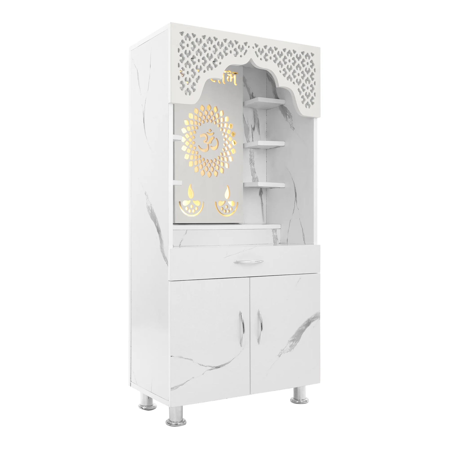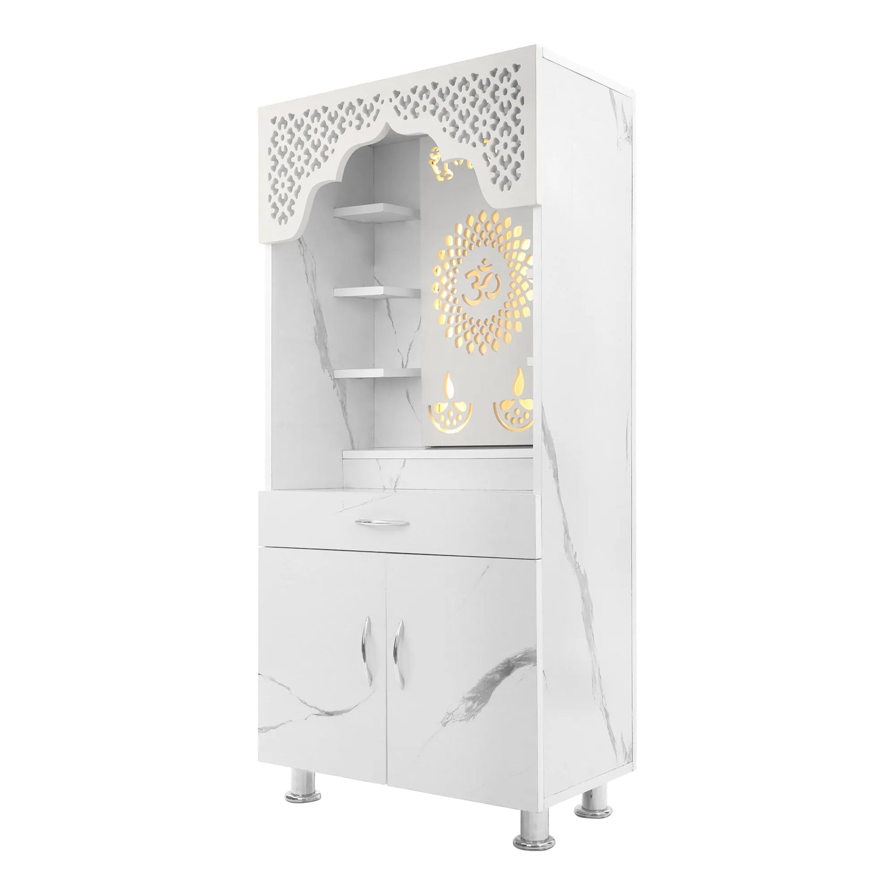 The temple includes multiple open shelves for idols and decor, a spacious drawer for accessories, and a double-door cabinet for secure storage. With its sturdy stainless steel handles and elevated base legs for easy cleaning, this mandir is not just a devotional centerpiece but also a durable addition to modern homes.