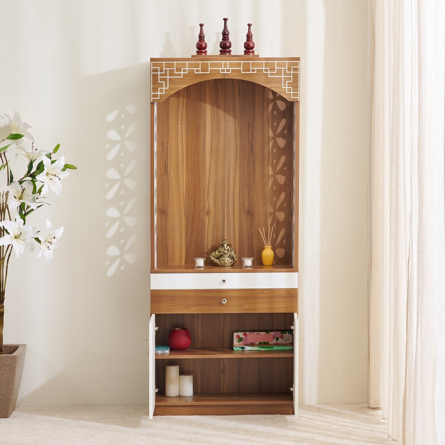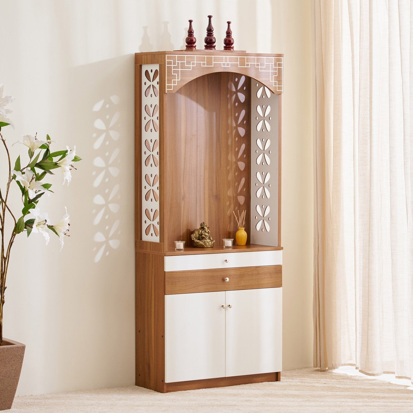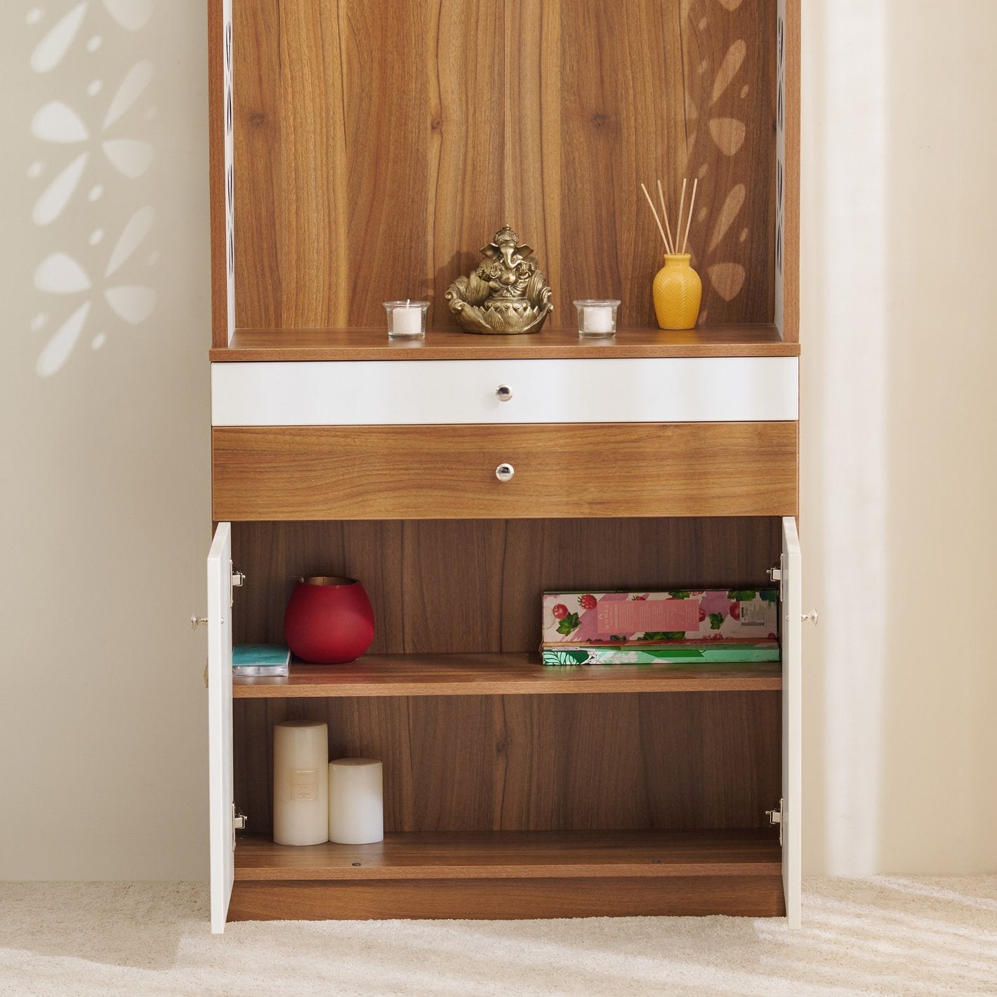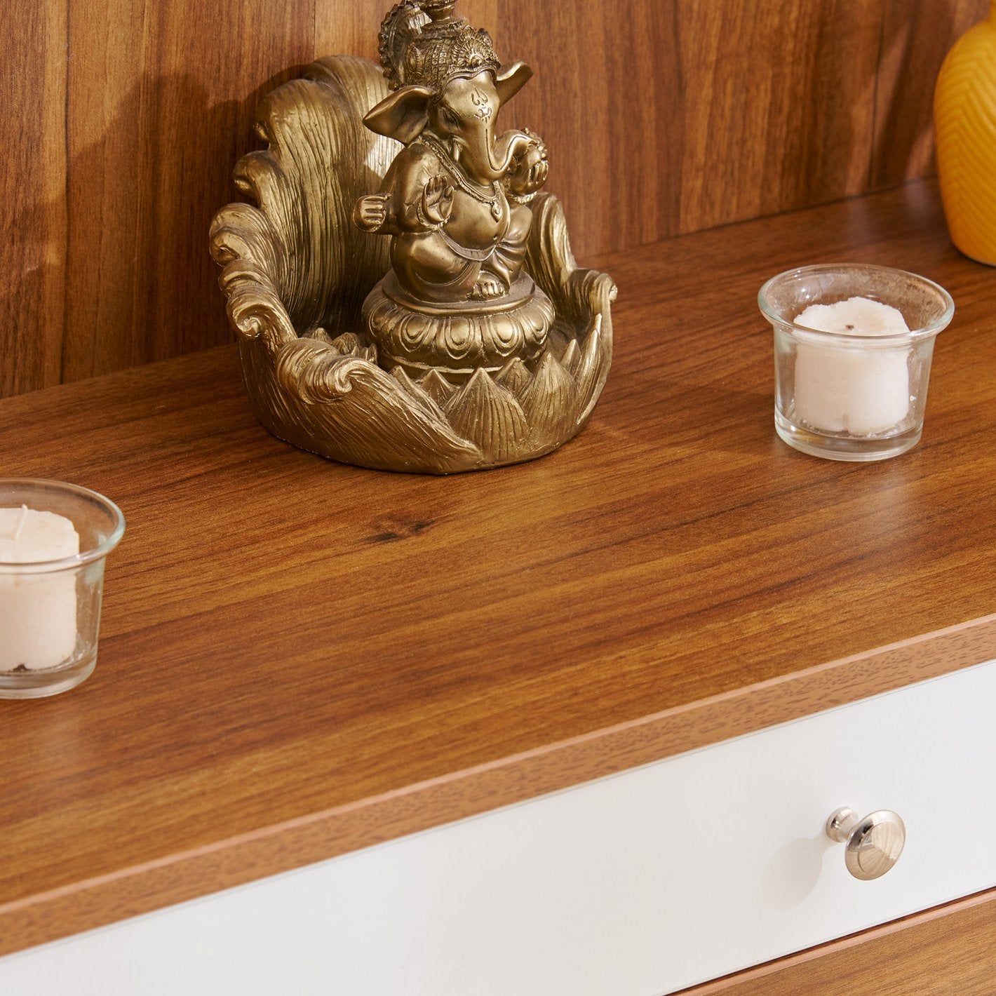 The spacious altar area is perfect for placing idols, candles, and essential puja items, while the sleek drawer and cabinet provide ample storage to keep your worship essentials organized and within easy reach. The combination of warm wood tones with elegant white accents lends a sophisticated and harmonious look that complements any modern or traditional décor.