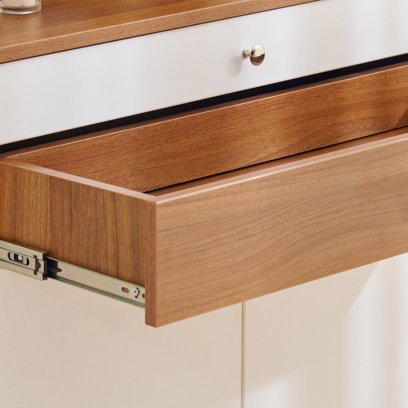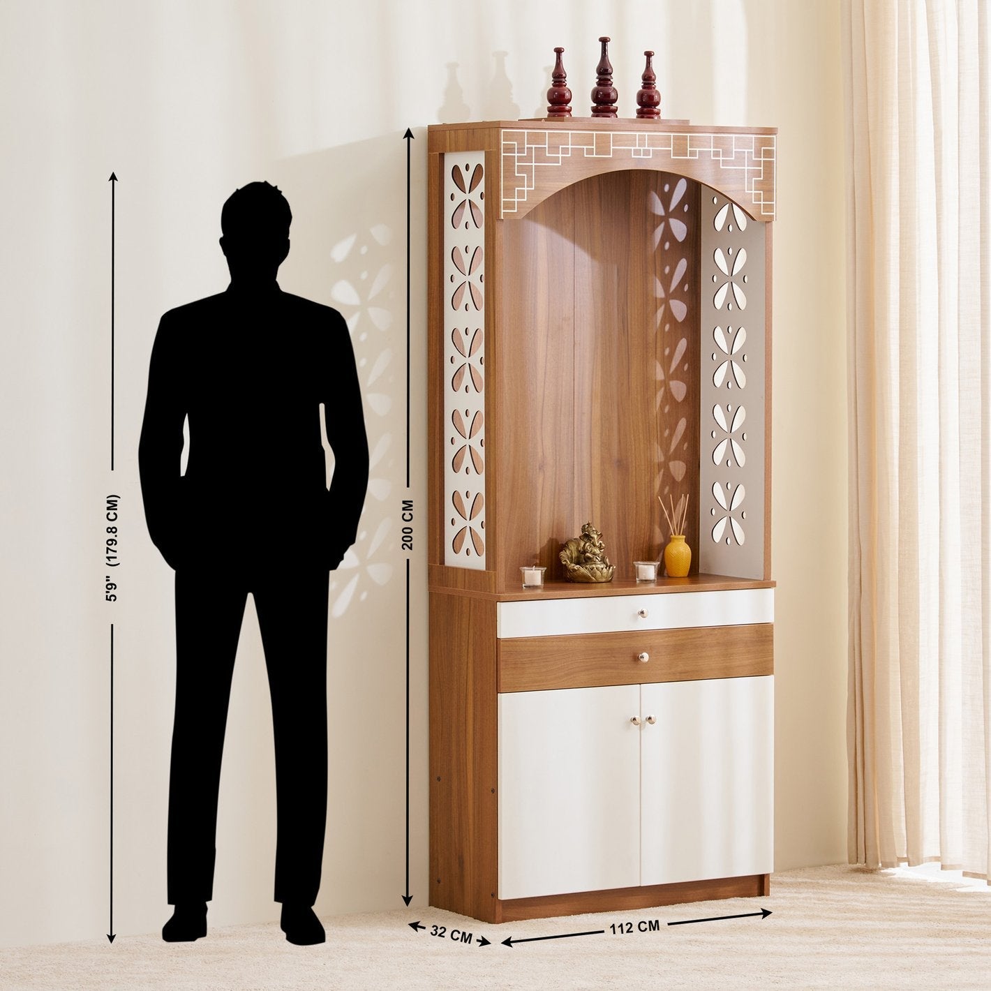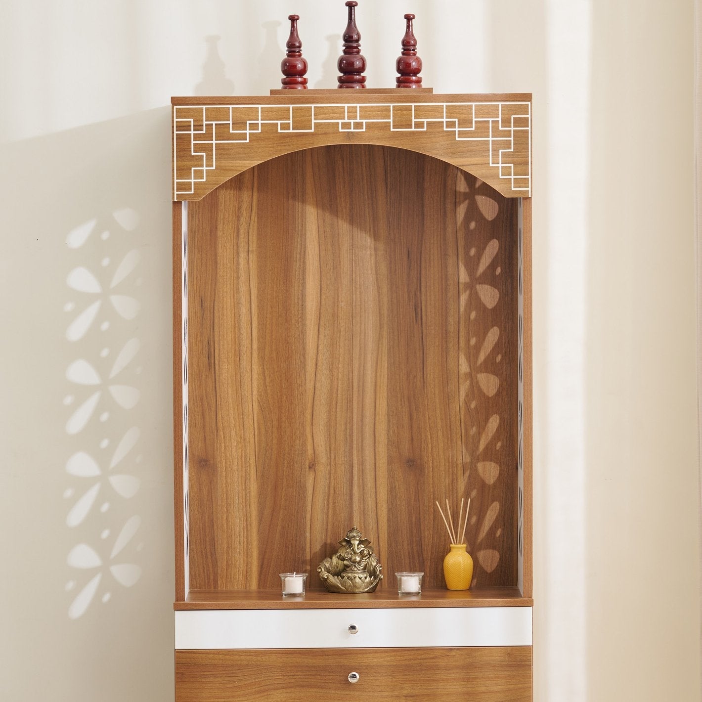 The spacious altar area is perfect for placing idols, candles, and essential puja items, while the sleek drawer and cabinet provide ample storage to keep your worship essentials organized and within easy reach. The combination of warm wood tones with elegant white accents lends a sophisticated and harmonious look that complements any modern or traditional décor.