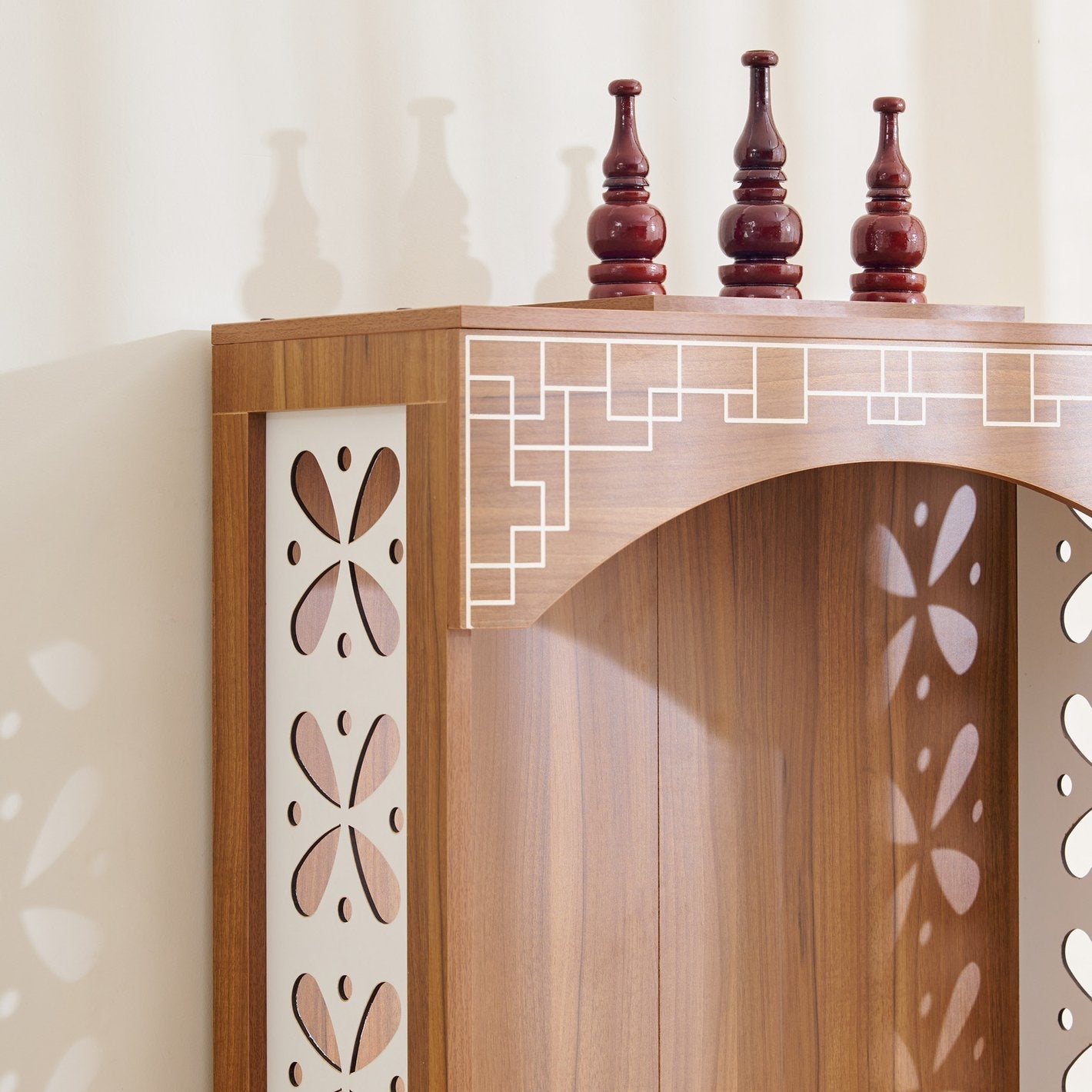Elevate your spiritual space with the Omkarwood Divine Elegance Puja Unit, expertly crafted from premium engineered wood to bring timeless beauty and durability to your home. This thoughtfully designed puja unit features intricate floral cutout patterns that allow gentle light to filter through, creating a serene and sacred ambiance during your prayers.