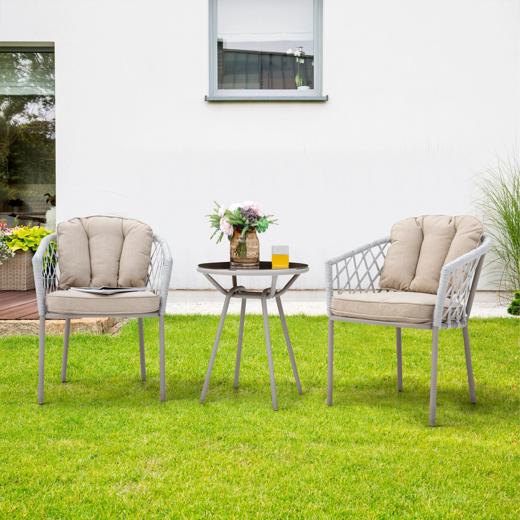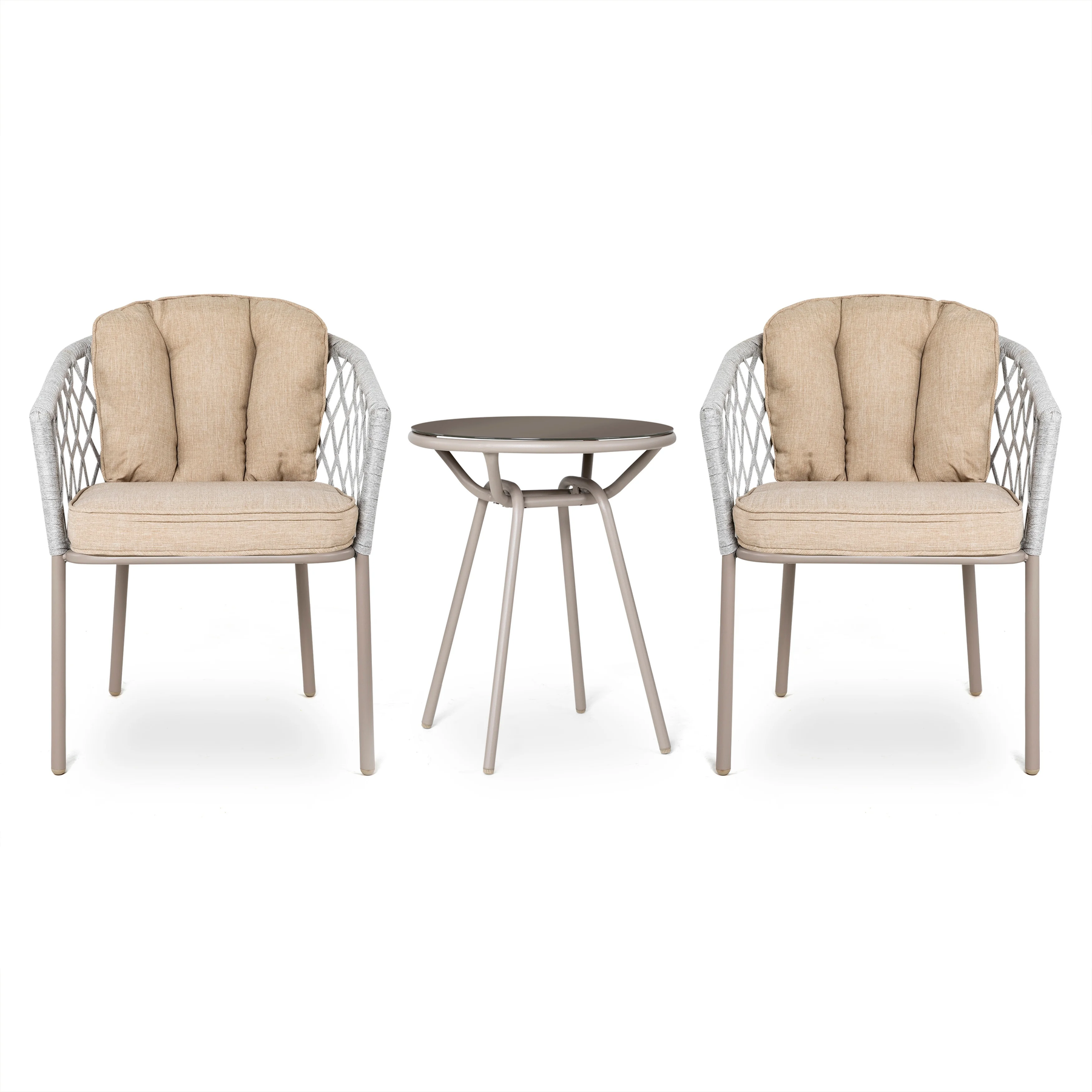 Surfer Outdoor Patio Seating Set 2 Chairs and 1 Table Set (Silver + Beige) Braided & Rope