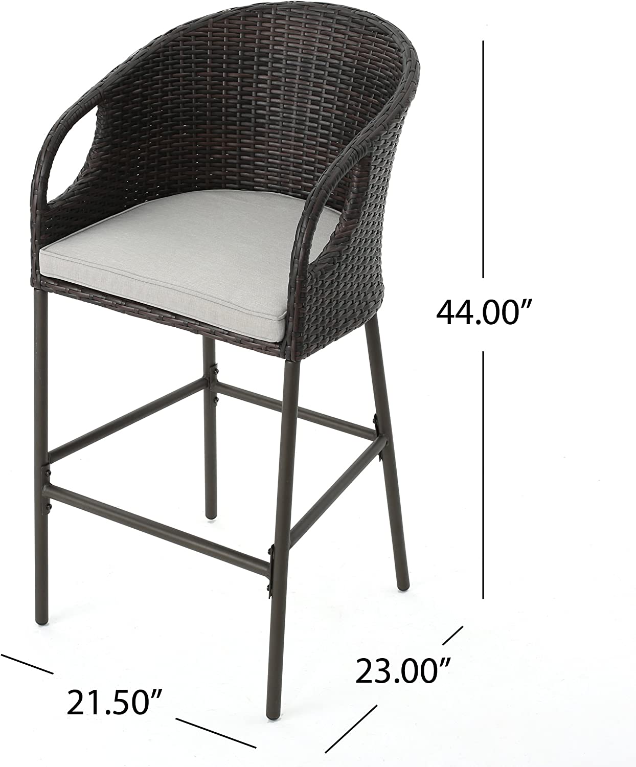• Patio Bar Chair This includes high-top Bar chairs. The e-coated steel frames and hand-woven wicker seats are weather resistant to guard against inclement weather. The  Bar stool is coated to guard against everyday wear and tear. The chairs can be easily stored under the high dining table making this set a perfect space saver for any outdoor area.